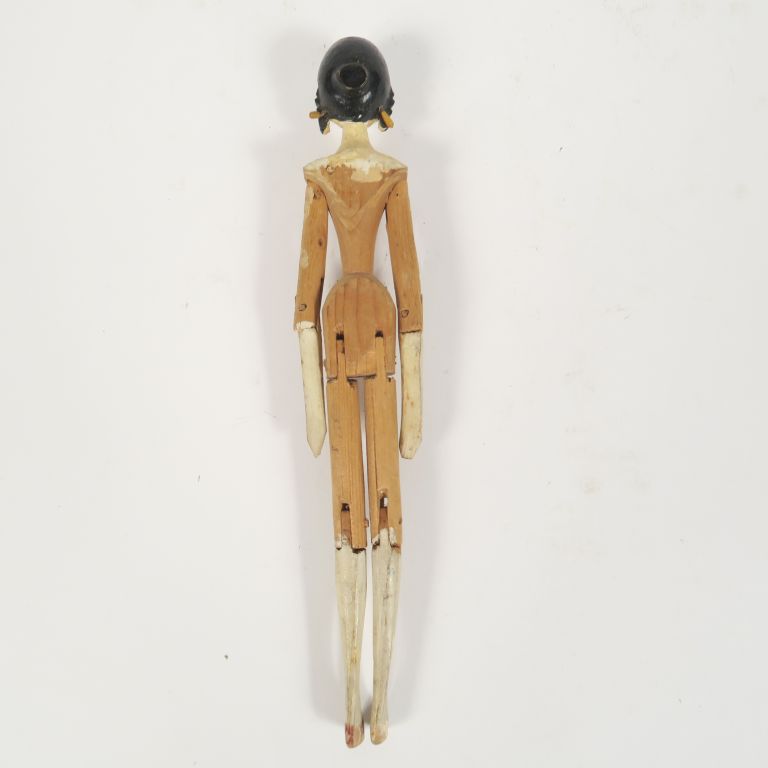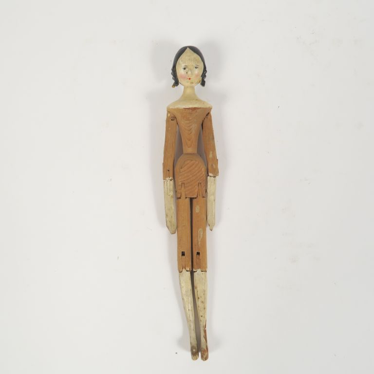 Poupée en bois articulé allemande circa 1840/1850 GRODNERTAL en bel état présentée sans vêtement coiffure atypique et boucles d'oreille, peinture du visage soignée. Taille 22 cm