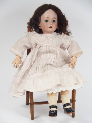 Poupée française tête Fleishmann en porcelaine, yeux fixes bleu, bouche ouverte, oreilles percées, corps composition articulé SFBJ en bel état, vêtements en partie anciens, perruque ancienne. H. 50 cm