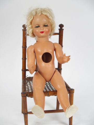 Poupée Jumeau année 50 manque le système parlant dans le torse, bel état avec perruque en acétate blonde. 44 cm