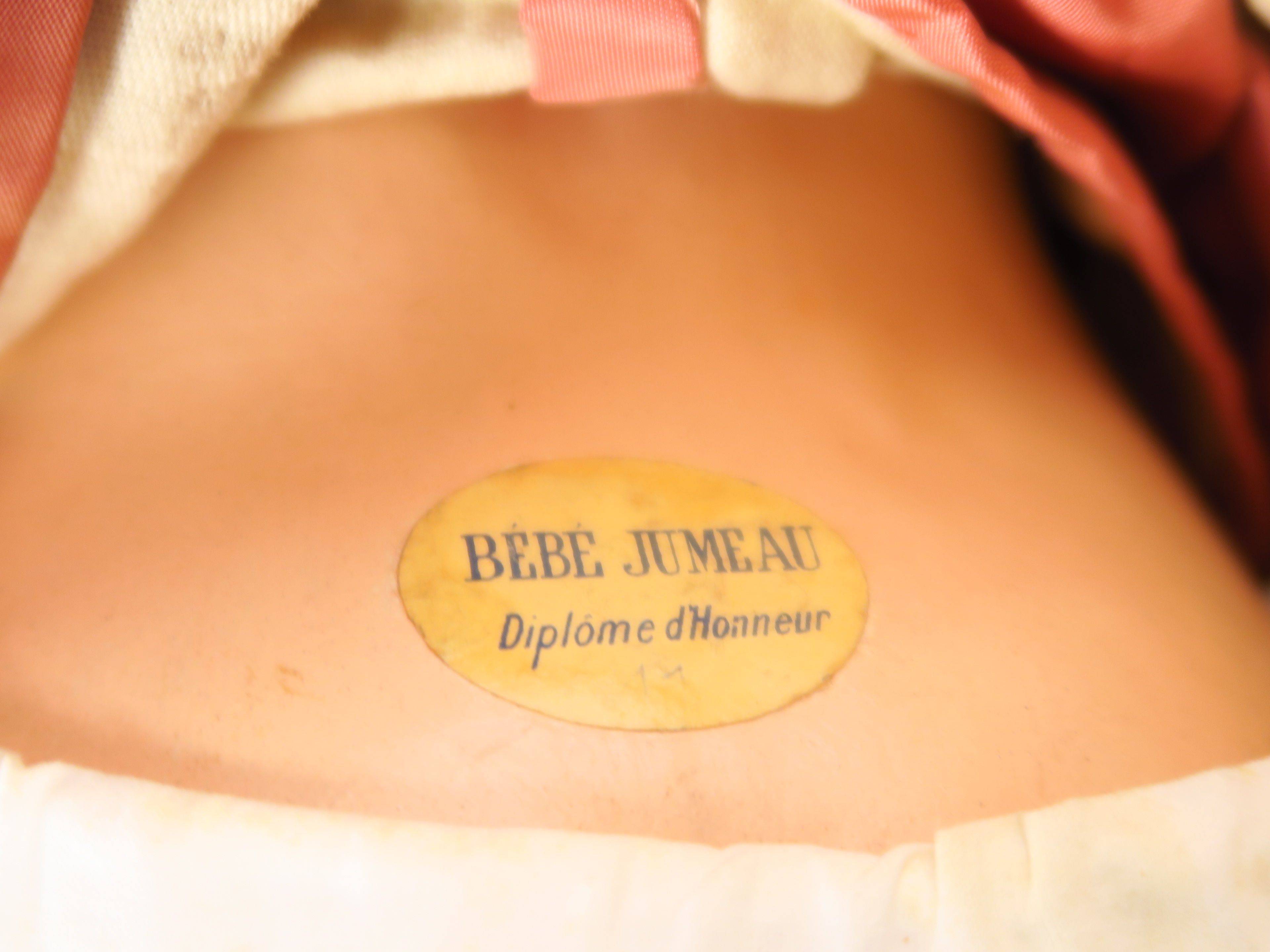 Poupée Jumeau, bouche fermée taille 11 marquée au tampon rouge déposée tête jumeau brevetée SGDG, yeux fixes bleus (perruque collée), corps en composition articulé marqué à l'étiquette diplôme d'honneur. Taille 61 cm