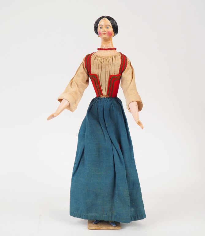Poupée milieu du 19e en papier mâché. Tête buste provenant certainement d'Allemagne d'origine folklorique corps tissu et composition. H. 38 cm. (Accident à la base du vêtement). Expert : Murielle Auffret.