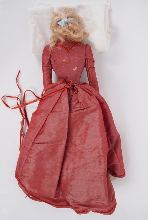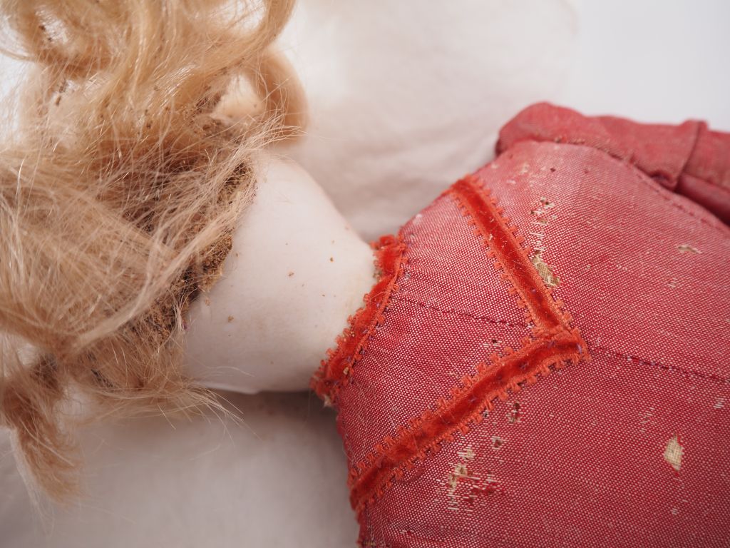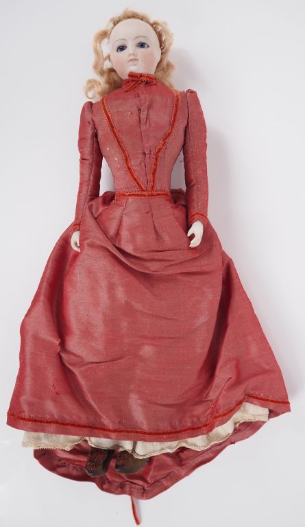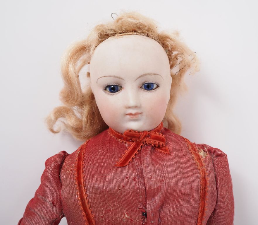 Poupée parisienne avec une tête pivotante sur buste en porcelaine sans marque yeux fixes bleu cobalt, corps de tissus bourré raide aux mains de biscuit en parfait état, chaussures de bébé E.J taille 5 at vêtement anciens en état d’usage 45 cm Expert : Murielle Auffret