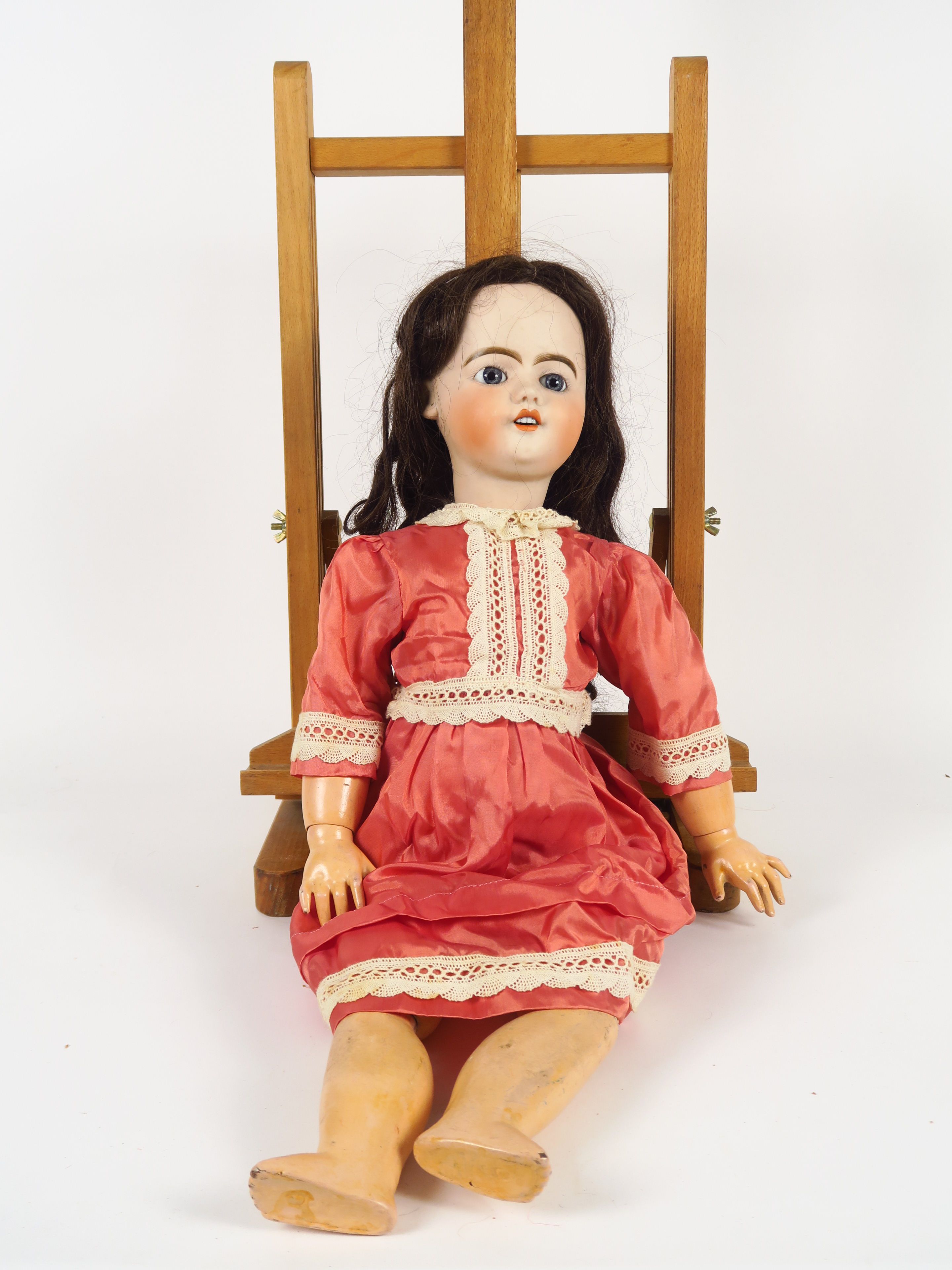 Poupée SFBJ déposée en creux, taille 9, bouche ouverte, yeux d'émail bleus, corps en composition, vêtements de style. Taille 64 cm