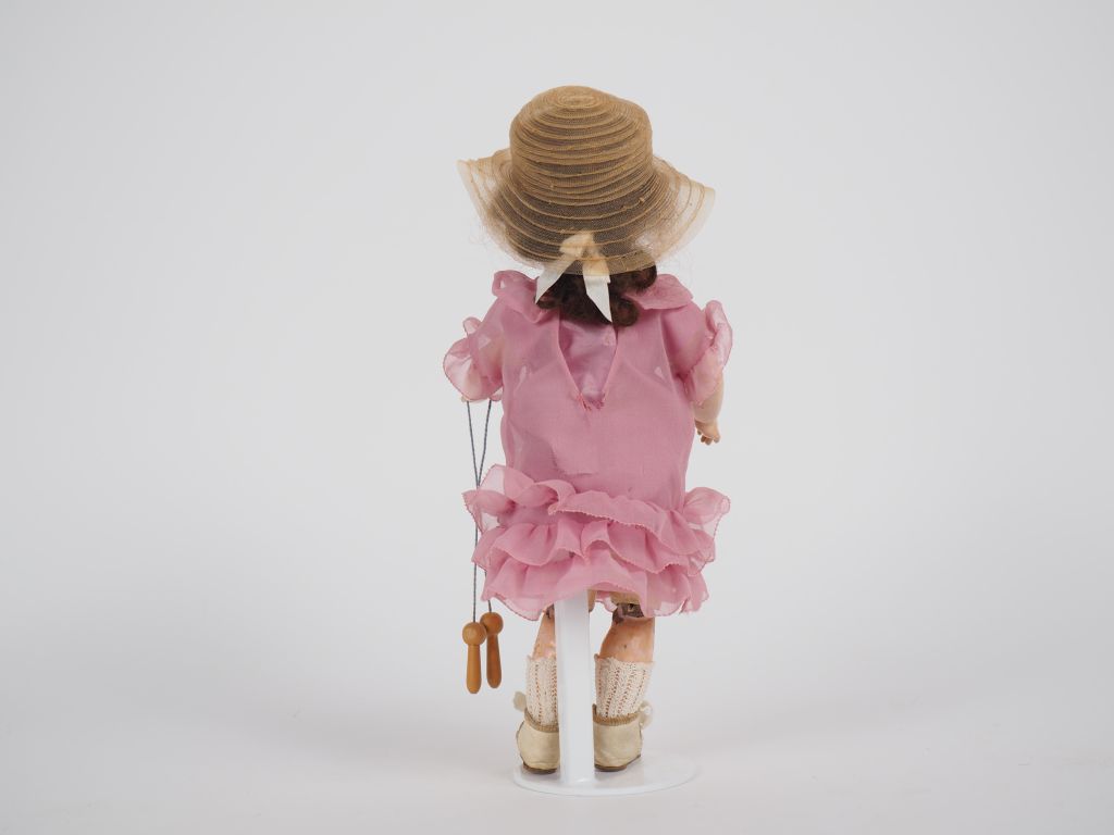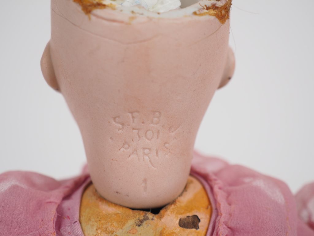 Poupée SFBJ tête porcelaine bouche ouverte yeux basculants bleus perruque en cheveux bruns, marqué SFBJ 301 Paris 1, corps composition articulé marqué 2 entre les épaules et 1 sous le pied, Circa 1910 1915, taille 27 cm. Bon état. Vêtements de style ( robe déchirée), chaussures et chaussettes anciennes, restaurée. Cette poupée a sa corde à sauter