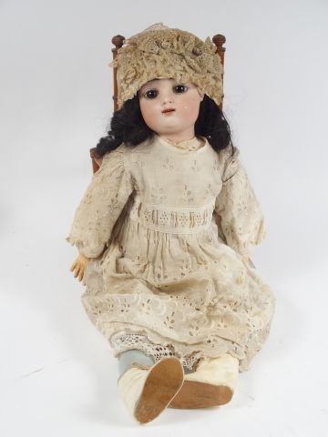 Poupée tête porcelaine Gautie marquée en cartouche FG, yeux fixes brun, bouche ouverte avec 6 dents (fel circulaire au front se divisant en deux au dessus de l'oreille) corps articulé 5 pièces, bottines anciennes, perruque et bonnet anciens. 65 cm (blanc sur la joue)