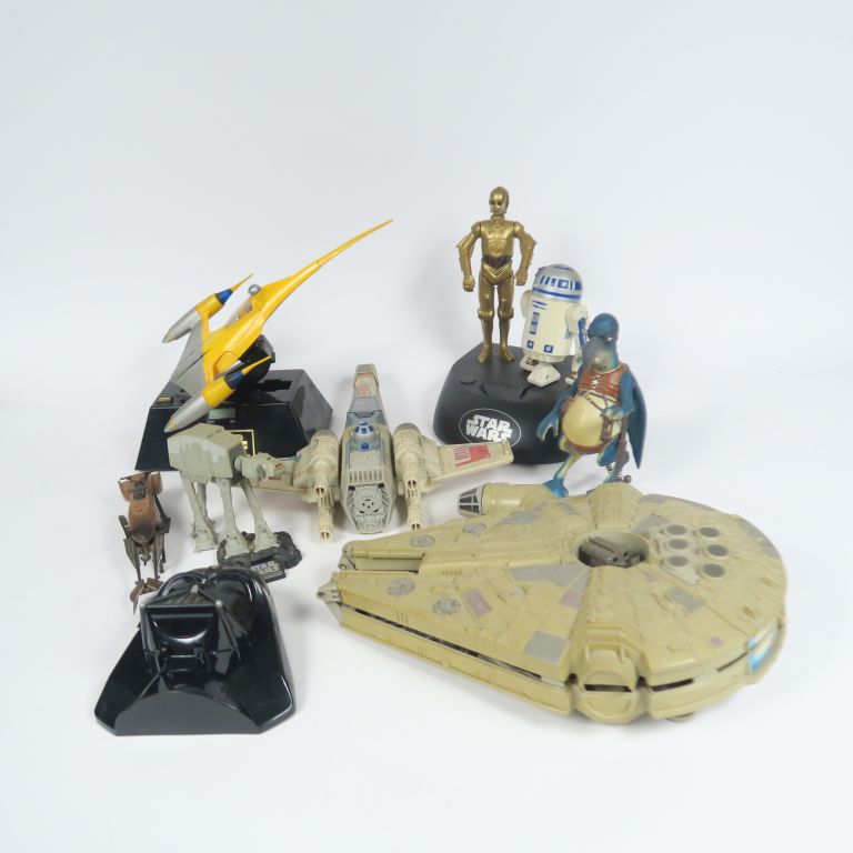 STAR WARS. Une tirelire Animatronique C3PO et R2D2 et un réveil avec le vaisseau NA BOO Star Fighter (manque un des cache piles) : on y joint 2 grands vaisseaux : Tonka Starfigther X Ming (manque les lasers aux bouts des ailes), Faucon Millenium 1995 et tête de Dark Vador, un petit vaisseur Jet Star de 15 cm
