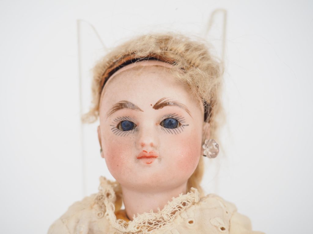 STEINER. "Bébé". C 4/10. Système Bourooin. Marqué au tampon rouge à l'arrière de la tête, bouche fermée, corps composition articulé d'origine. Perruque Mohair. H. 23 cm.