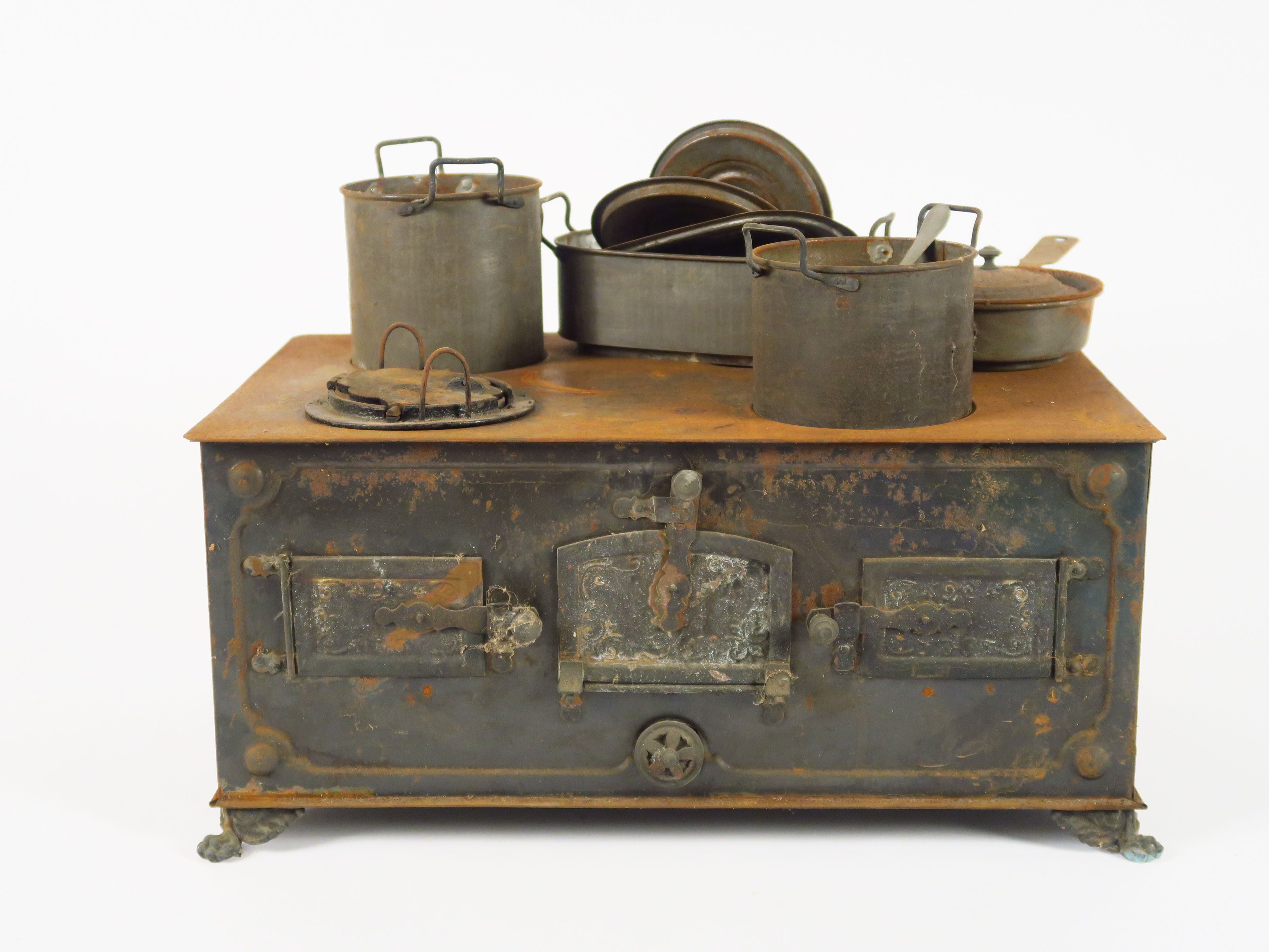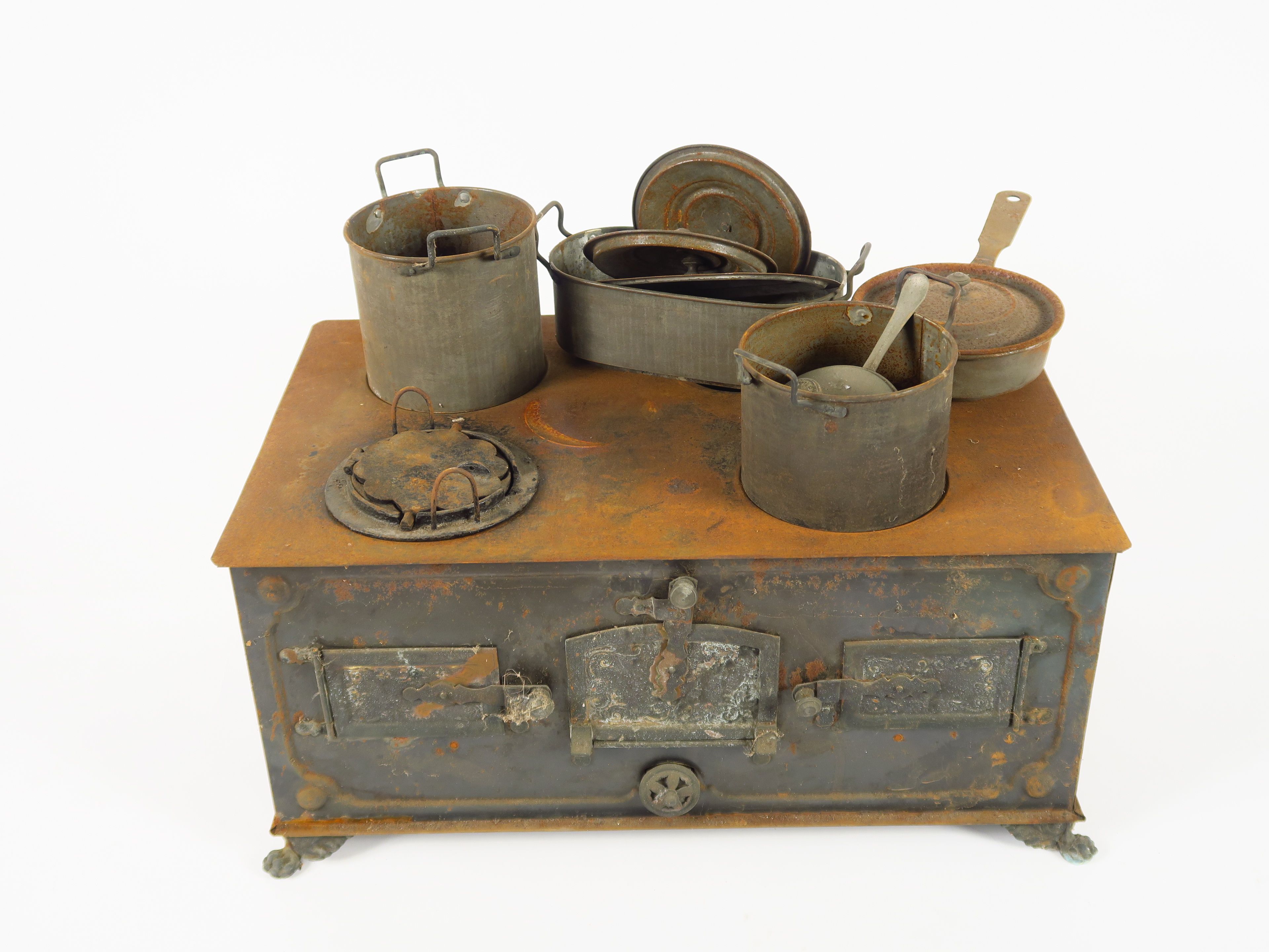 Très belle cuisinière en tôle XIXème avec casserole et éléments (manque la cheminée). Dim. 40 x 25 cm