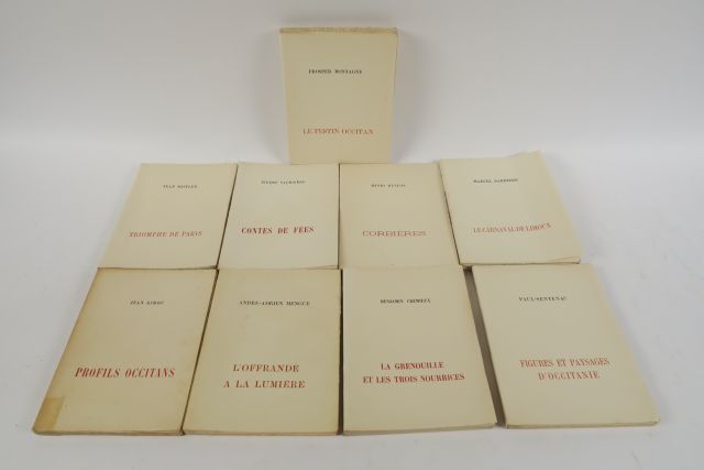 A LA PORTE D'AUDE. Collection d'Ecrivains Audois. Carcassonne, Editions d'Art Jordy s.d. (Ca 1930). – ALIBERT (François-Paul). La Renaissance de la Tragédie. – STROWSKI (Joseph-Fortunat). Le Porteur du Rouleau des Morts. – MENGUE (André-Adrien). L'Offrande à la Lumière. – CAMP (Jean). Minouche au Pays du Cid. – MISTLER (Jean). Triomphe de Paris. – LEBRAU (Jean). Montagne Noire. – SENTENAC (Paul). Figures et Paysages d'Occitanie. – BARRIÈRE (Marcel). Le Carnaval de Limoux. – DUCLOS (Henri). Corbières. – ALBERNY (Luc). L'Enlèvement de la Cité. – VALMIGÈRE (Pierre). Contes de Fées. – ASTRE (Achille). Quelques Artistes de mon Temps. – DELTEIL (Joseph). La Belle Aude. – GIROU (Jean). Profils Occitans. – CRÉMIEUX (Benjamin). La Grenouille et les trois Nourrices. – montagné (Prosper). Le Festin occitan. – REVERDY (Pierre). Pierres blanches, poèmes. 17 volumes in-8, brochés. Collection complète. Tous les textes sont en édition originale. Portraits en héliogravure en frontispice. Exemplaires du tirage sur Lafuma (dernier papier), sauf Mengue (1/10 Hollande), Alibert et Campe (1/35 sur Arches). Le livre de Delteil La Belle Aude est enrichi d'un envoi a.s. à une dame.