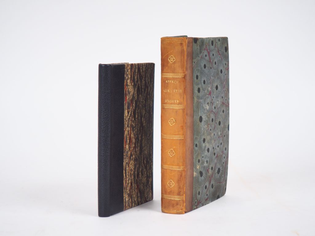 [ALGÉRIE]. APERÇU HISTORIQUE, STATISTIQUE ET TOPOGRAPHIQUE SUR L’ÉTAT D’ALGER, à l’usage de l’armée expéditionnaire d’Afrique, avec plans, vues et costumes , publié par ordre de son Excellence le Ministre de la guerre. P., Picquet, 1830. In-12 ½ basane blonde glacée, dos lisse cloisonné et orné, titre doré (Reliure de l’époque) , (2) ff. de faux-titre et titre, VII-216 pp., 14 pl. montées sur onglets, (11) ff. vierges. ÉDITION ORIGINALE. 5 CARTES et PLANS dépliants et 9 PLANCHES dépliantes lithographiées. Le nombre de planches varie selon les exemplaires. ¶ Tailliart, 35 – [ANONYME]. VOYAGE À ALGER, ou Description de cette ville et du royaume d'Alger, avec l’état de son commerce, de ses forces de terre et de mer , son gouvernement et les mœurs et usages de ses habitans. Avignon, Chaillot Jeune, 1830. In-16 ½ chagrin noir moderne, dos lisse muet , 142 pages. TROISIÈME ÉDITION augmentée d’un Vocabulaire Français-Algérien. SANS les vue, plan et carte annoncés. ENSEMBLE DE 2 OUVRAGES.