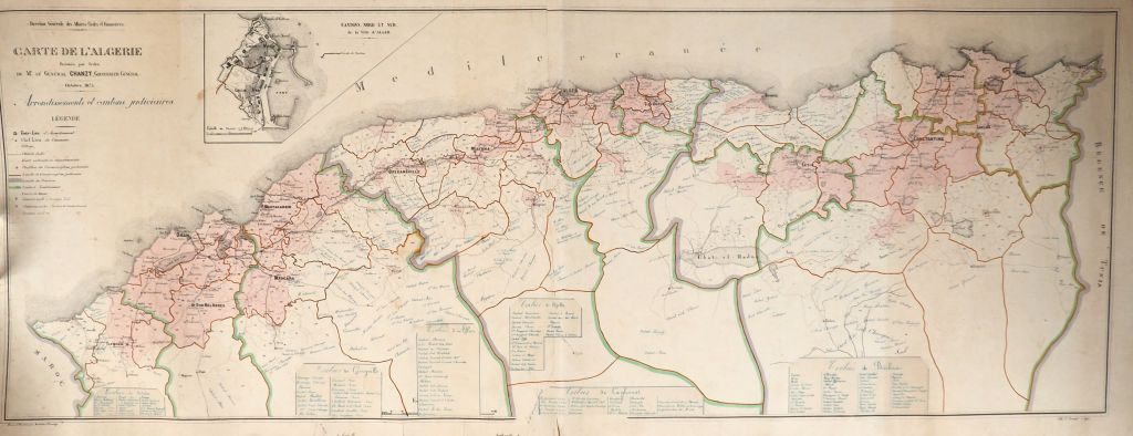 [ALGÉRIE]. FREMIN (A.-R.). THÉÂTRE DE LA GUERRE EN AFRIQUE comprenant les Régences d’Alger, de Tunis, Tripoli et de l’Empire de Maroc. Avec Plans détaillés de la Baie et des Fortifications de la Ville d’Alger et de ses environs. Paris, Basset, 1830. Carte (74,5 X 52,5 cm) en 2 parties assemblées. GRANDE CARTE gravée et aquarellée – CARTE DE L’ALGÉRIE dressée par ordre de M. le Général Chanzy. Alger, Lith. Veuve Ferrand, 1875. Carte entoilée (130 X 53 cm). Avec un plan des Cantons nord et sud de la Ville d’Alger et des légendes manuscrites dans la partie inférieure de la carte.