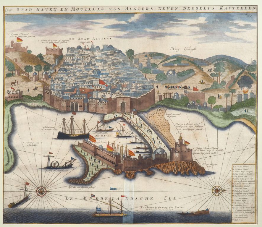 [ALGÉRIE]. KEULEN (Gerard van) [1678-1726]. DE STAD HAVEN EN MOUILLIE VAN ALGIERS NEVEN DESSELFS KASTEELEN. Amsterdam, [c. 1720]. Carte (58,5 X 50,5 cm environ) sous verre, cadre bois. BELLE CARTE HOLLANDAISE DÉBUT XVIIIe gravée et entièrement aquarellée représentant la cité, le port et le môle d’ALGER.