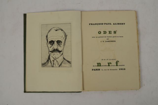 ALIBERT (François-Paul). Odes. Avec un portrait de l'auteur gravé au burin par J.E. LABOUREUR. Paris, Nouvelle Revue Française 1922. pt in-8, broché. Edition originale. 1/1000 num. sur vergé d'Arches.