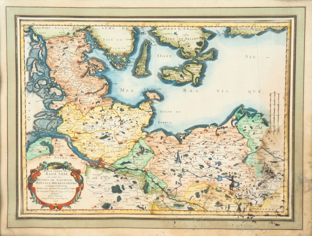 [ALLEMAGNE]. SANSON (N.). HERTZOG THUMB POMMERN/DUCHÉ DE POMÉRANIE [et] BASSE-PARTIE DE LA BASSE-SAXE, où sont les Duchés de Sleswick, Holsace, Meckelenbourg, et Lanwenbourg. P., Sanson, 1654 - 1657. Deux cartes (50 X 32 cm et 52,5 X 38 environ) sous verre, cadre bois. Mouillure dans l’angle inférieur droit avec traces de moisissure à la 2nde carte. DEUX CARTES XVIIe GRAVÉES ET ENTIÈREMENT AQUARELLÉES.
