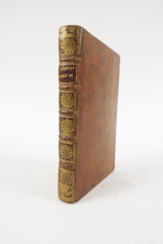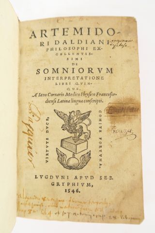ARTEMIDORE. Artemidori Daldiani. De Somniorum interpretatione libri quinque. Lyon, Seb. Gryphe 1546. in-8, 296 pp. Veau glacé, larges fleur. dor. au dos, pce de titre (Rel. du XVIIIe s.). Nombreuses annotations manuscrites de l'époque. Petit manque en marge latérale aux 3 derniers ff. avec perte de qqs lettres. Célèbre ouvrage ancien sur l'interprétation des rêves.