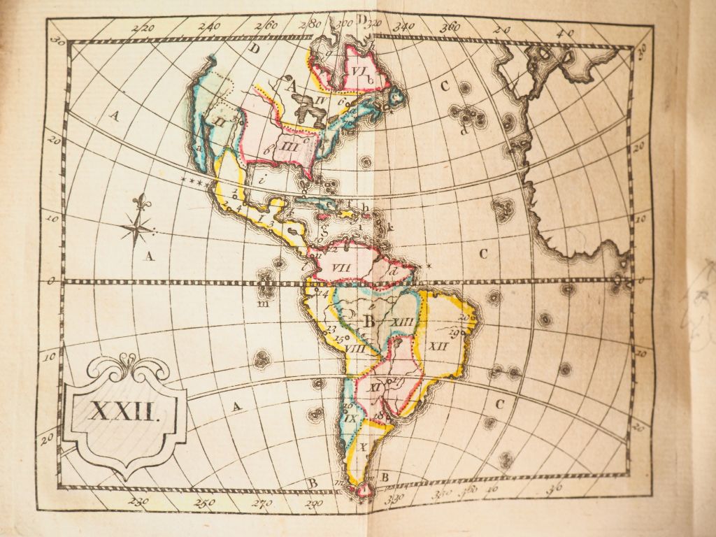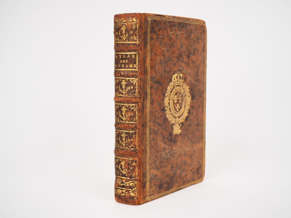 [ATLAS]. ATLAS DES ENFANS, ou Méthode nouvelle, courte, facile et démonstrative, pour apprendre la géographie. En XXII Cartes enluminées. Avec un nouveau traité de la sphère, où l’on explique le Mouvement des Astres, les Systèmes du Monde anciens modernes, l’usage des Globes des Mesures Géographiques. Avec figures. Amsterdam, Schneider, 1760. In-12 veau fauve marbré, plats ornés d’un triple encadrement de filet doré avec armes frappées or au centre, dos à nerfs orné, pièce de titre, tranches rouges (Reliure de l’époque). Coins émoussés. ÉDITION ORNÉE DE 22 CARTES dépliantes coloriées dont 1 carte des Amériques. Le Traité de la sphère relié à la suite contient une page de titre propre et 2 PLANCHES dépliantes coloriées numérotées « 23 » et « 24 » représentant des sphères. BEL EXEMPLAIRE aux ARMES DE FRANCE. ¶ Gumuchian, 388.