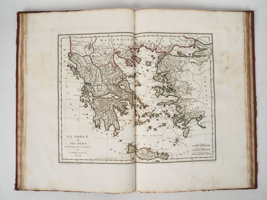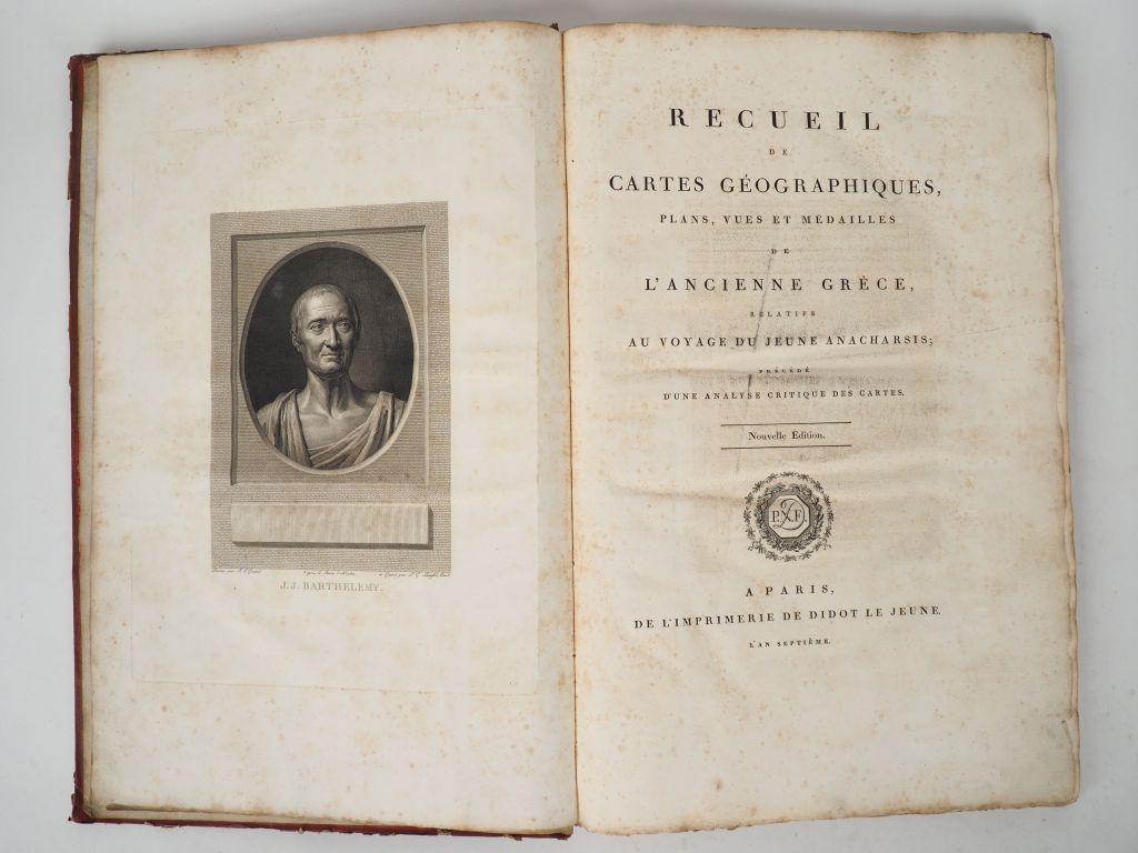 [ATLAS]. [BARTHELEMY]. RECUEIL DE CARTES GÉOGRAPHIQUES, plans, vues et médailles de l’ancienne Grèce, relatifs au voyage du jeune Anacharsis, précédé d’une analyse critique des cartes. Paris, Didot le jeune, 1799. Grand in-folio ½ chevrette à grain long grenat, dos lisse cloisonné, titre doré (Reliure de l’époque) , portrait, 56 pages, VII pages, 39 planches, (1) f. d’explication des médailles, 1 planche de médailles. Manques à la coiffe inférieure, début de fente à un mors, coupes et coins frottés avec manques de papier. ATLAS de 39 PLANCHES numérotées de 1 à 38 (2 planches n°19) : cartes (dont une GRANDE CARTE dépliante à double page, gravée par Tardieu et rehaussée à l’aquarelle intitulée Carte générale de la Grèce et d’une grande partie de ses colonies), plans, vues, etc.