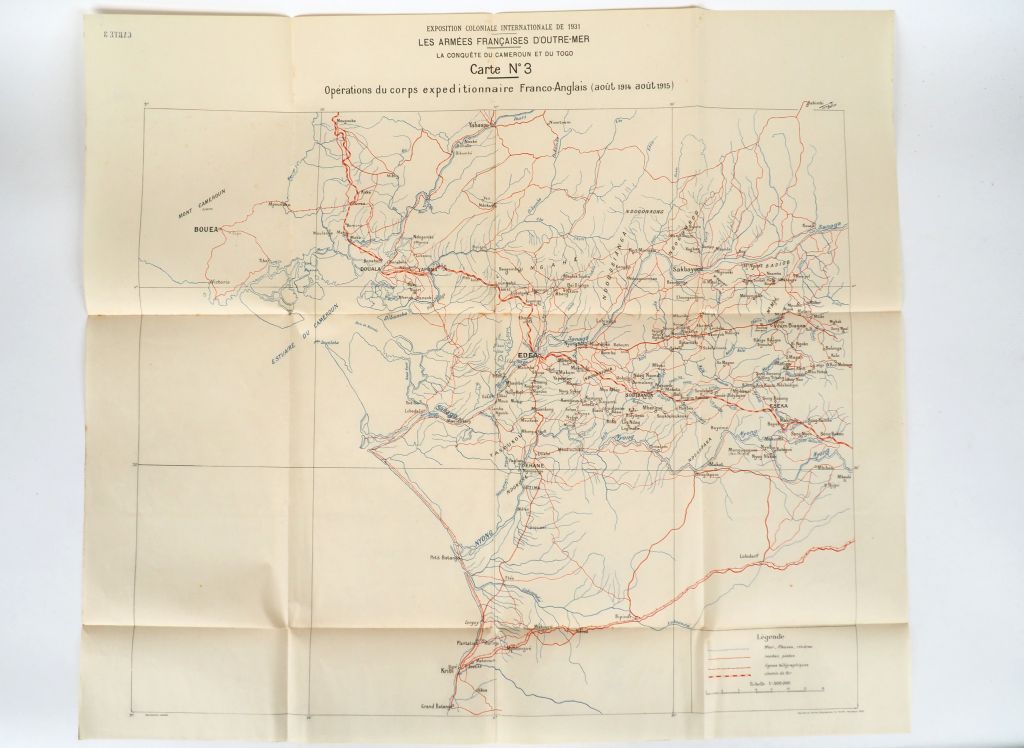 [ATLAS]. CONQUÊTE DU CAMEROUN ET DU TOGO (La). 11 cartes papier pliées et numérotées sous chemise postérieure grand in-4 ½ basane noire muette, étui bordé. RARE ENSEMBLE DE 11 CARTES publiées à l’occasion de l’Exposition Coloniale Internationale de Paris 1931, section Les Armées Françaises d’Outre-Mer.