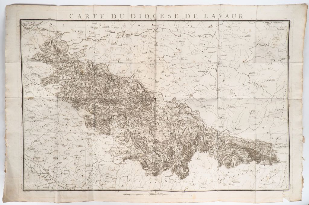 [ATLAS DE LA PROVINCE DE LANGUEDOC]. CARTE DES DIOCESES DU LANGUEDOC dessinées par Bourgoin, gravées par Aldring (1781). 24 cartes repliées 100 x 124 cm environ, sauf 3 ou 4 de plus petit format montées sur onglet et reliées d'époque dans un volume in-folio en veau, largement frotté, attachements, fentes à quelques plis et petit trou à une carte.