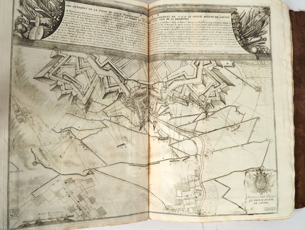 [ATLAS]. [FRICX]. TABLE DES CARTES DES PAYS-BAS ET DES FRONTIÈRES DE FRANCE, avec un Recueil des plans de villes, sièges et batailles données entre les hauts alliés et la France. Bruxelles, Eugène Henry Fricx, 1712. In-folio basane fauve de l’époque , (1) f. de titre, 105 pl. La reliure est ruinée (ne subsiste que la peau qui recouvrait les cartons), mais le corps d’ouvrage est en bon état : quelques brunissures, taches et déchirures. PREMIÈRE ÉDITION de cet IMPORTANT ATLAS composé d’un feuillet de TITRE illustré allégorique, dessiné et gravé par Harrewyn et de 105 CARTES topographiques, plans de villes, forteresses, sièges et champs de bataille. La plupart des planches sont à double page et/ou dépliantes, dont un certain nombre rehaussées à l’AQUARELLE. Elles couvrent les Pays-Bas, la Belgique et le nord de la France et ont probablement été réalisées pour illustrer les guerres qui se sont déroulées dans cette partie du nord de l’Europe. La page de titre annonce 76 CARTES : cet exemplaire est donc considérablement augmenté, notamment de cartes postérieures, certaines datées aux alentours des années 1745 , on trouve également 5 CARTES à double page et aquarellées sur Le cours du Po. EN L’ÉTAT.