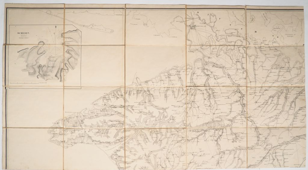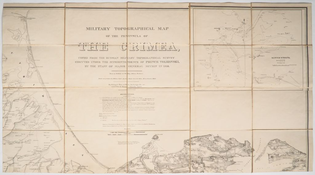 [ATLAS]. KELLY (J. G.) – KING (T. K.). MILITARY TOPOGRAPHICAL MAP OF THE PENINSULA OF THE CRIMEA. Horse Guards, 1854. Quatre parties (chacune 65 X 120 cm environ) entoilées sous étui de basane grenat de l’éditeur, titre The Crimea doré au 1er plat. GRANDE CARTE réalisée d’après une carte russe exécutée en 1816 sous la superintendance du Prince Volkonski.