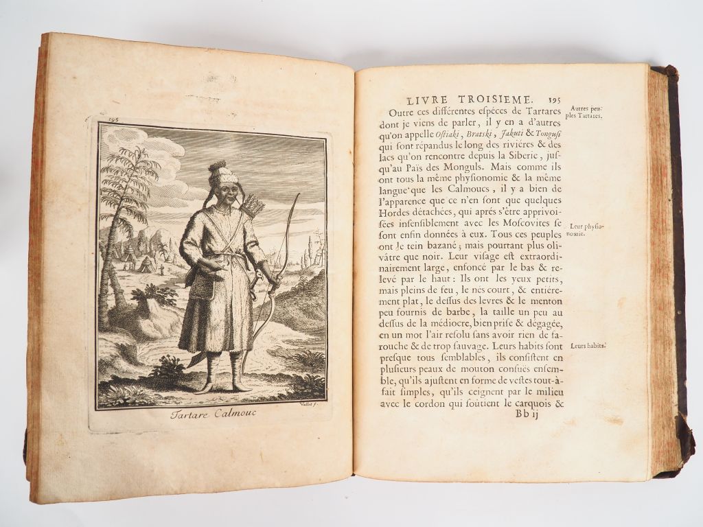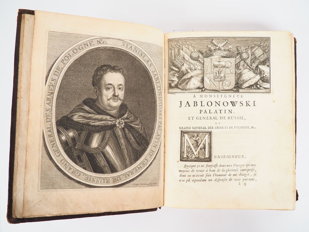 AVRIL (Paul). VOYAGE EN DIVERS ÉTATS D'EUROPE ET D'ASIE, pour découvrir un nouveau chemin à la Chine. Contenant plusieurs Remarques curieuses de Physique, de géographie, d’Hydrographie d’Histoire. Avec une Description de la grande Tartarie, des différens Peuples qui l’habitent. Paris, Barbin, Boudot, Josse, 1692. In-4 veau fauve marbré, dos à nerfs orné, titre doré, tranches mouchetées en rouge (Reliure de l’époque). Coiffe supérieure manquante et petit manque à la coiffe inférieure, 4 coins émoussés avec manques aux coupes, petit travail de ver en fond de cahier à quelques ff. ÉDITION ORIGINALE. Elle est illustrée d’un PORTRAIT gravé de Stanislaw Jablonowski (1634-1702) par Picart, de 3 PLANCHES gravées h.-t. et d’une CARTE dépliante de la Sibérie. SÉDUISANT EXEMPLAIRE, de la bibliothèque de Raymond Louis SABATIER D’ASTORS (XVIIIe), avec son ex-libris héraldique gravé par Baumès. ¶ Cordier, 2088.