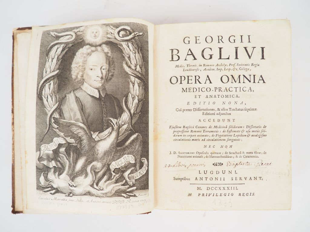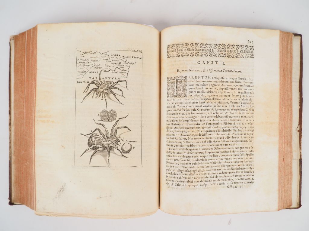 BAGLIVI (Georgii). Opera omnia medico-practica et anatomica. Editio nova Lugd. Servant 1733. in-4, XIII-3 ff.- 854 pp. -1f. Veau, dos orné (Rel. d'époque) manques en tête et en queue de dos. Portrait et 3 figures h.-t. dont une de la mythique tarentule dont la morsure était réputée mortelle. Le seul remède connu était les danses dites tarentelles.