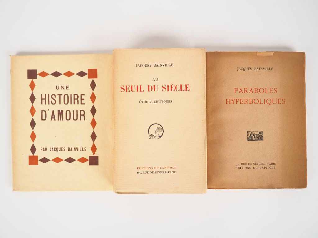 BAINVILLE (Jacques). Au seuil du Siècle. Etudes critiques. Paris, Ed. du Capitole 1927. in-12, br. Ed. originale. Alfa num. - Paraboles hyperboliques. Paris, Ed. du Capitole 1931. in-8, br. Ed. originale. Alfa num. - BAINVILLE (Jacques). Une histoire d'amour. Portrait par Pierre Payon. Paris, Ed. des Cahiers libres 1929. in-8,broché. Ed. originale. Vélin Lafuma num. Ensemble de 3 vol.
