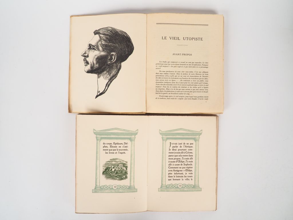 BAINVILLE (Jacques). Les sept portes de Thèbes. Bois gravé par Pierre GANDON, Paris, Editions du Cadran 1931. in-8, broché, sous étui. 1/30 vélin de Hollande. - Le Vieil utopiste. Paris, Librairie de France 1926. in-4, br. Ensemble de 2 volumes