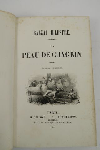 BALZAC ILLUSTRÉ. La peau de chagrin. Paris, Delloye, Lecou 1838. gd in-8. 1/2 chagrin bleu, dos long orné de 3 cadres de fil. dor. droits et courbes, rinceaux à froid, tr. marbr. (Rel. d'époque). Edition illustrée de vignettes gravées sur acier dans le texte. Bel exemplaire, frais, malgré qqs rares rouss. éparses.