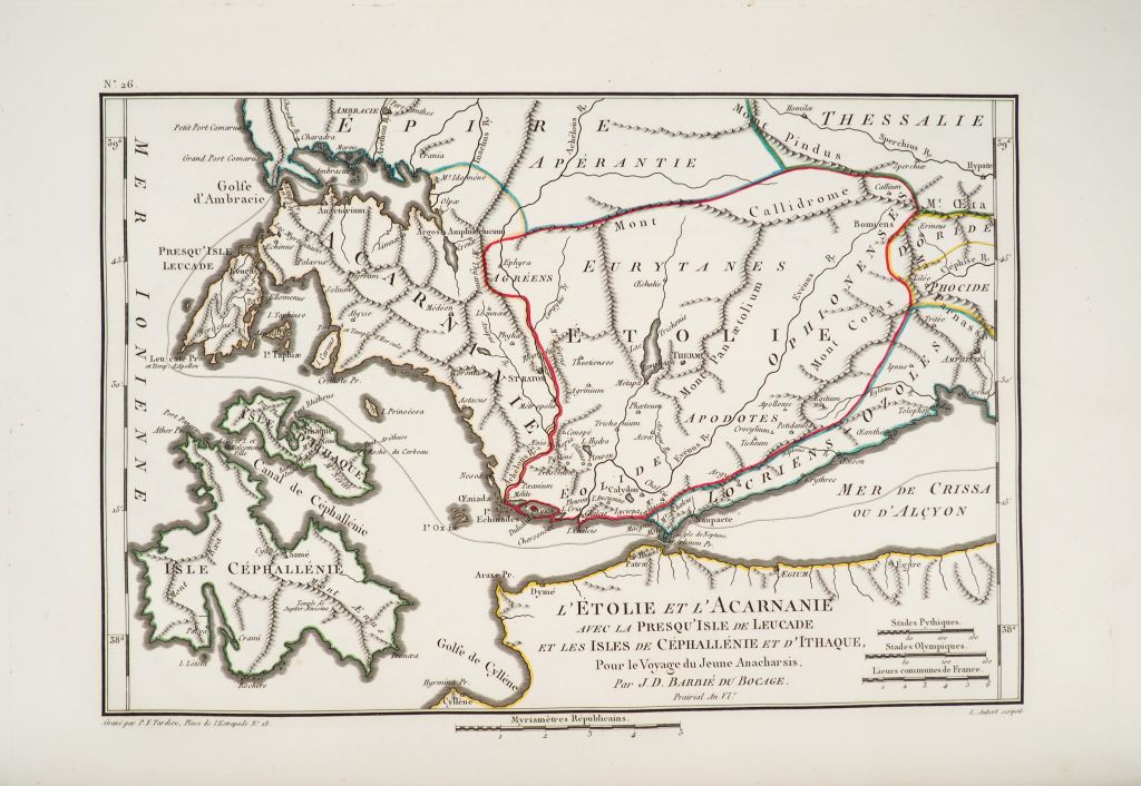 [BARTHELEMY, J.J]. Recueil de cartes géographiques, plans, vues et médailles de l'Ancienne Grèce, précédé d'une analyse critique des cartes. Paris, Imprimerie de Didot Le Jeune An VII (1799). In-folio. Cartonnage papier de l'époque. Portrait, 30 cartes et plans gravés par Tardieu dont deux grandes cartes générales double et triple de Barbié du Bocage, 9 vues de temples et sites de la Grèce ancienne et une planche de médaille.
