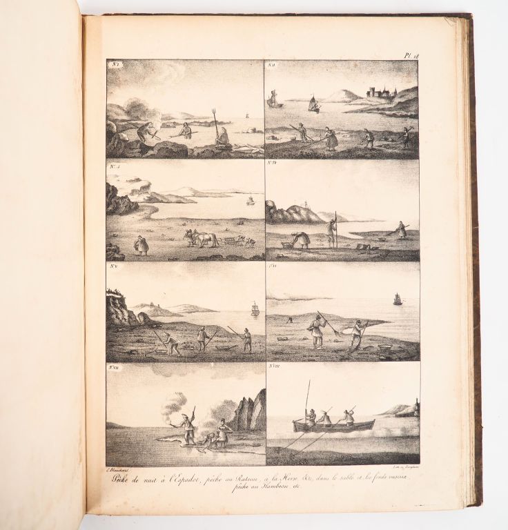 BAUDRILLART (J. J.). TRAITÉ GÉNÉRAL DES EAUX ET FORÊTS, CHASSES ET PÊCHES. Quatrième partie. Dictionnaire des Pêches. Atlas. P., Arthus-Berttrand, 1827. Petit in-folio ½ basane fauve, dos lisse orné, pièces de titre et de tomaison (Reliure de l'époque) , (1) f. de faux-titre, 17 pages dont titre. Rousseurs et quelques planches brunies. ÉDITION ORIGINALE de l’ATLAS SEUL, sans le volume de texte. 44 PLANCHES lithographiées par E. Blanchard montées sur onglets, représentant des poissons, ustensiles et outils de pêche, scènes de pêche, etc. et 15 pages de description des planches. De la bibliothèque « Eugène Reuss » [1847-1927], inspecteur des forêts à Fontainebleau, avec son ex-libris héraldique.