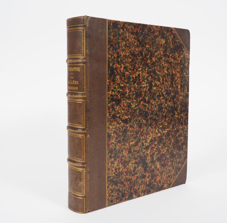 BEATTIE (W.). THE WALDENSES, or Protestant Valleys of Piedmont and Dauphiny. London, G. Virtue, 1836. In-4 ½ maroquin havane foncé à coins, dos à nerfs orné de caissons dorés, titre doré (Reliure de l'époque). Pointes de rousseurs éparses. ÉDITION ORIGINALE de ce grand classique, très illustré, sur les vallées vaudoises. Un PORTRAIT, vignette de titre, 70 PLANCHES h.-t. gravées sur acier et une CARTE dépliante.