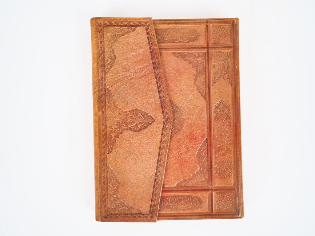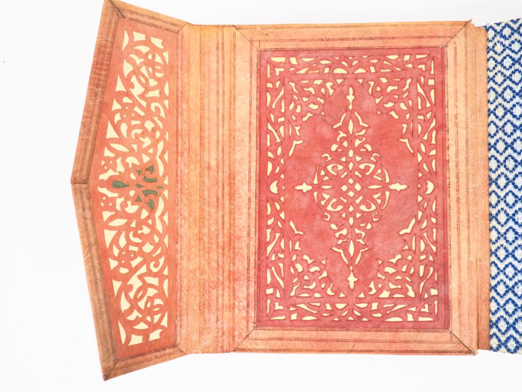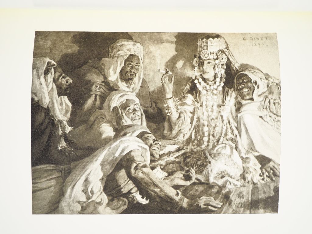 BEN IBRAHIM (S.). TABLEAUX DE LA VIE ARABE. P., Piazza, [début XXe]. Petit in-4 reliure portefeuille de basane maroquinée fauve, ornements à froid à décor oriental, doublures de basane maroquinée brique à décor ajouré, gardes de soie, plats de couverture conservés (Reliure de l’époque). ÉDITION ILLUSTRÉE d’un portrait et 25 PLANCHES h.-t. reproduisant en noir des tableaux d’Étienne DINET. BELLE RELIURE ORIENTALE réalisée dans l’esprit de celle des corans de voyage.