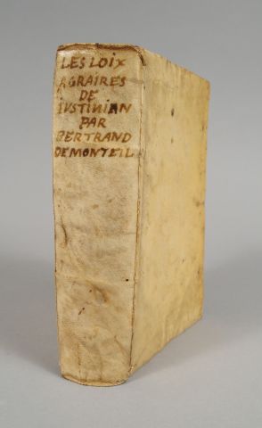 BERTRAND (F. de, sieur de MONTELS). Les loix agraires de l'Empereur Justinian, trad. du grec en français, avec les annotations sur chacune d'icelles. Lyon, Ancelin 1613. in-8, 8 ff.-435 pp.+table. Vélin souple (Rel. d'époque). Curieux et rare ouvrage constitué des passages, parmi les lois de l'Empereur Justinien, consacrés à l'agriculture.