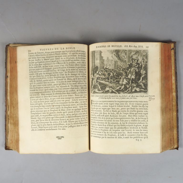 BIBLE DE ROYAUMONT. L'histoire du Vieux et du Nouveau Testament, représentée avec des figures et des explications éditiantes, tirées des Saints Pères. Troisième édition. Paris, Le Petit 1671. in-4. Veau, dos lissé orné (Rel. de l'époque) 268 belles figures en taille douce en tiers de page. Reliure usagée, mors fendu.