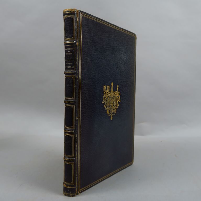 BLAZE DE BURY (Henry). Goethe et le mouvement littéraire de Weimar. Paris, Impr. de Fournier 1839. gd in-8, 168 pp. Maroquin ardoise, caissons dor. au dos et Armes au centre des plats, dent. int., tr. dor. (Koehler). Rare tiré à part de la Revue des Deux Mondes. Belle reliure signée du relieur préféré de Charles Nodier. Malheureusement les charnières sont fendues.