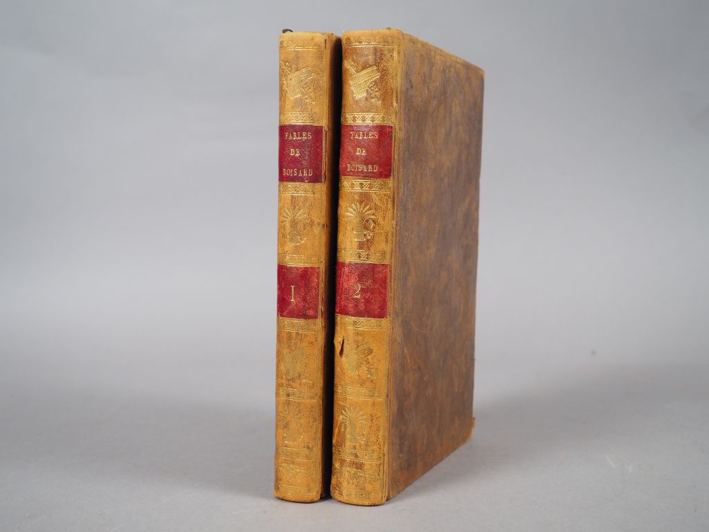 BOISARD. Fables. Paris, Lacombe 1777. 2 vol. in-8. Basane marbrée, dos lisse orné, pces de titre rouge (Rel. de l’époque). Edition illustrée de 2 vignettes de titre, 2 culs-de-lampe et 9 figures h.-t. de Monnet.