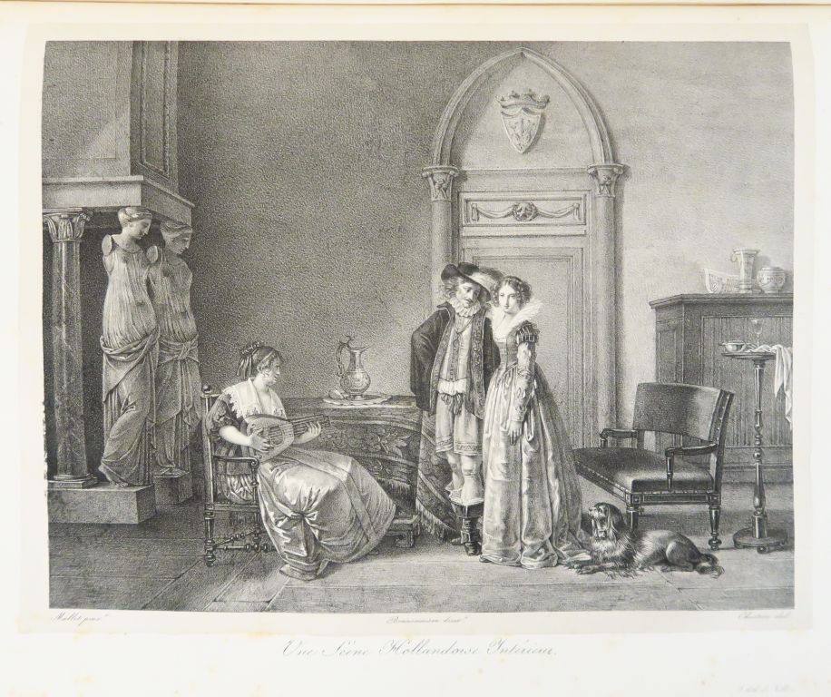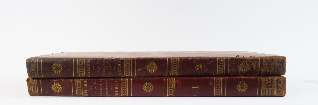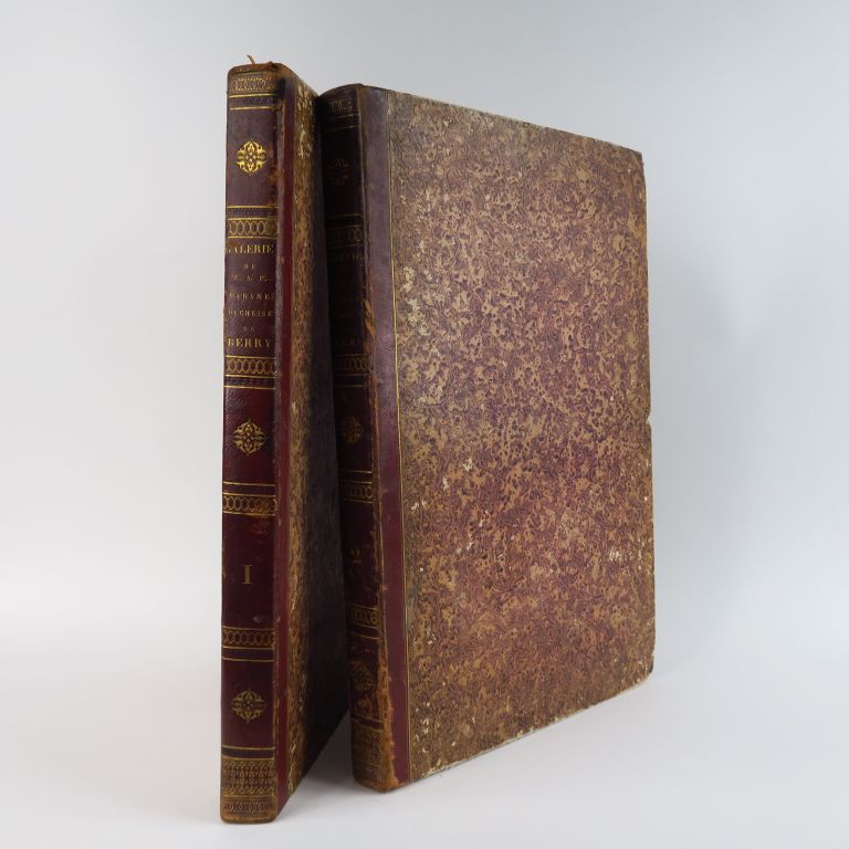 BONNEMAISON (Le Chevalier de). Galerie de son Altesse Royale Madame la Duchesse de Berry. Ouvrage dédié à S.A.R et lithographié par d'habiles artistes. Paris, Impr. Didot 1822. 2 vol. gd in-folio. 1/2 maroquin rouge, dos long orné de roulettes et fleur. dor. (Rel. de l'époque). 113 planches lithographiées sur chine appliqué reproduisant des tableaux de Boilly, Haudebourg-Lescot, Taunay, Demarne, Prud'hon, Horace Vernet, etc… . Une planche a été découpée, rousseurs, qqs. petites épidermures à la reliure.