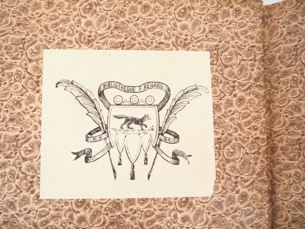 BOREL (P.). CHAMPAVERT. Contes immoraux. P., Renduel, 1833. In-8 chevrette aubergine, plats marron foncé ornés d’un encadrement de filets dorés, initiales couronnées or « J. S. » au centre du 1er plat, dos à nerfs orné de caissons dorés, pièce de titre (Reliure de l'époque) , 438 pp. Les 8 premiers ff. ont été montés sur onglets, avec petits manques en fond de cahier, petit manque à l’angle droit inférieur du f. titre, mouillure dans l’angle inférieur de la page 5, rousseurs et taches éparses, teinte du dos uniformément virée en havane. ÉDITION ORIGINALE RARE. Titre orné d’une grande vignette de Jean Gigoux, gravée sur bois par Godard, représentant André Vésale. De la bibliothèque « F. Renard », avec son ex-libris gravé , les initiales « J. S. » dorées au 1er plat n’ont pas été identifiées. ¶ Clouzot, 53 : « Très rare, très recherché. Aussi ne faut-il pas se montrer trop difficile sur la condition des exemplaires. »