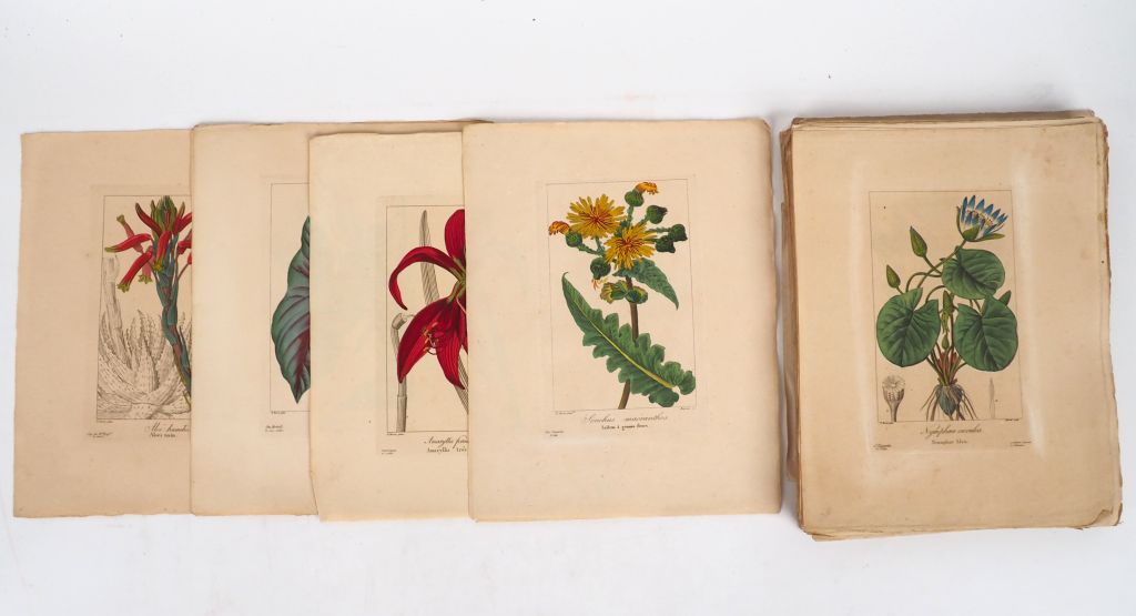 [BOTANIQUE]. MORDAUNT DE LAUNAY (Jean Claude Michel). HERBIER GÉNÉRAL DE L’AMATEUR. [P., Audot, 1816-27]. 113 planches au format grand in-4 (25 x 32 cm environ), 2 planches (24,5 X 31,5 cm environ) et 2 planches (14,5 X 22 cm). 113 PLANCHES non rognées gravées sur papier vergé, dessinées par Pancrace BESSA et aquarellées à l’époque. Ces planches, publiées en livraisons, proviennent de la 1ère édition de l’Herbier général de l’amateur publié durant le 1er quart du XIXe siècle. JOINT : 2 planches au format grand in-4 dessinées et peintes par Turpin et 2 petites planches dont l’une par Turpin et l’autre par Descourtilz. ¶ Nissen, BBI, 2323 – Plesch, 256.