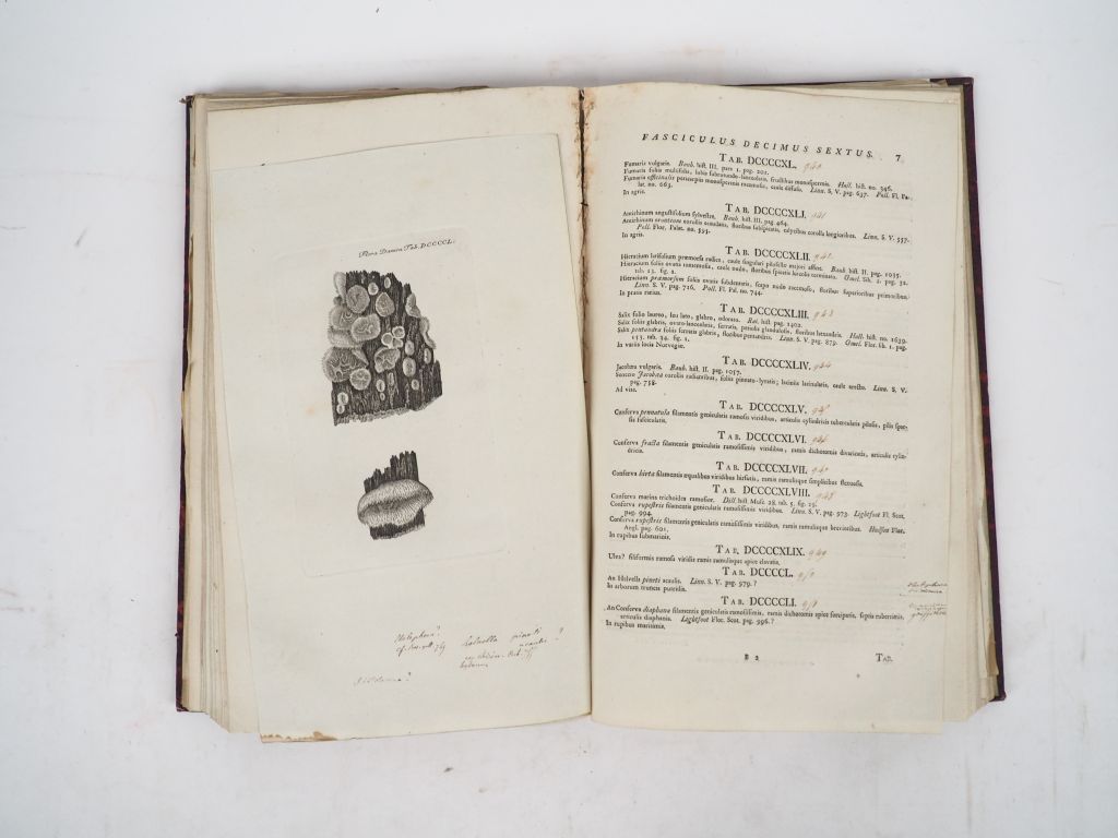 [BOTANIQUE]. OEDER (G. Ch.). ICONES PLANTARUM […] FLORAE DANICAE. Havniae, N. Mölleri, 1764. Neuf tomes reliés en un volume in-folio ½ basane havane, dos lisse cloisonné et orné, titre doré (Reliure XIXe). T. I : (1) f. titre général en rouge et noir, 12 pp., 12 pp., 10 pp. - T. II : (1) f. titre général en rouge et noir, 8 pp., 10 pp., 10 pp. et 3 pl. - T. III : (1) f. titre général en rouge et noir, 10 pp. et 2 pl., 10 pp. et 10 pl. de formats divers (certaines découpées), 8 pp. et 2 pl. découpées - T. IV : 8 pp. et 1 pl., 8 pp. et 2 pl. découpées, 8 pp. et 1 pl. découpée - T. V : (1) f. titre général en rouge et noir, 8 pp. et 1 pl., 8 pp. et 3 pl. découpées, 6 pp. et 4 pl. découpées - T. VI : (1) f. titre général en rouge et noir, 8 pp. et 1 pl., 10 pp. et 1 pl., 8 pp. - T. VII : (1) f. titre général en rouge et noir, 8 pp., 8 pp., 8 pp. et 1 pl. couleurs - T. VIII : (1) f. titre général en rouge et noir, 10 pp. et 4 pl. en couleurs dont 1 découpée, 8 pp. et 1 pl. couleurs, 6 pp. et 1 pl. coul. - T. IX : (1) f. titre général en rouge et noir, 8 pp., 11 pp. (dont faux-titre relié à la suite), 12 pp., 13 pp. 9 PREMIERS TOMES contenant les 27 premiers fascicules de cette flore d’Europe du nord très rare complète. L’ouvrage complet contient 57 fascicules en 18 tomes et a été publiée de 1764 à 1883, soit sur une période de presque 120 ans. EN L’ÉTAT. ¶ Nissen, BBI, 2249 – Magnificent Collection of Botanical Books, Sotheby’s, april 1987, 259 – Plesch, 351.