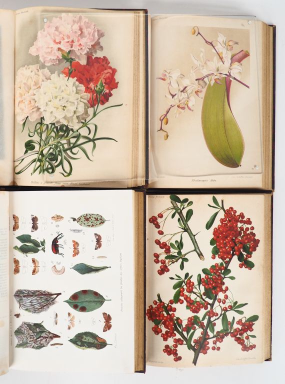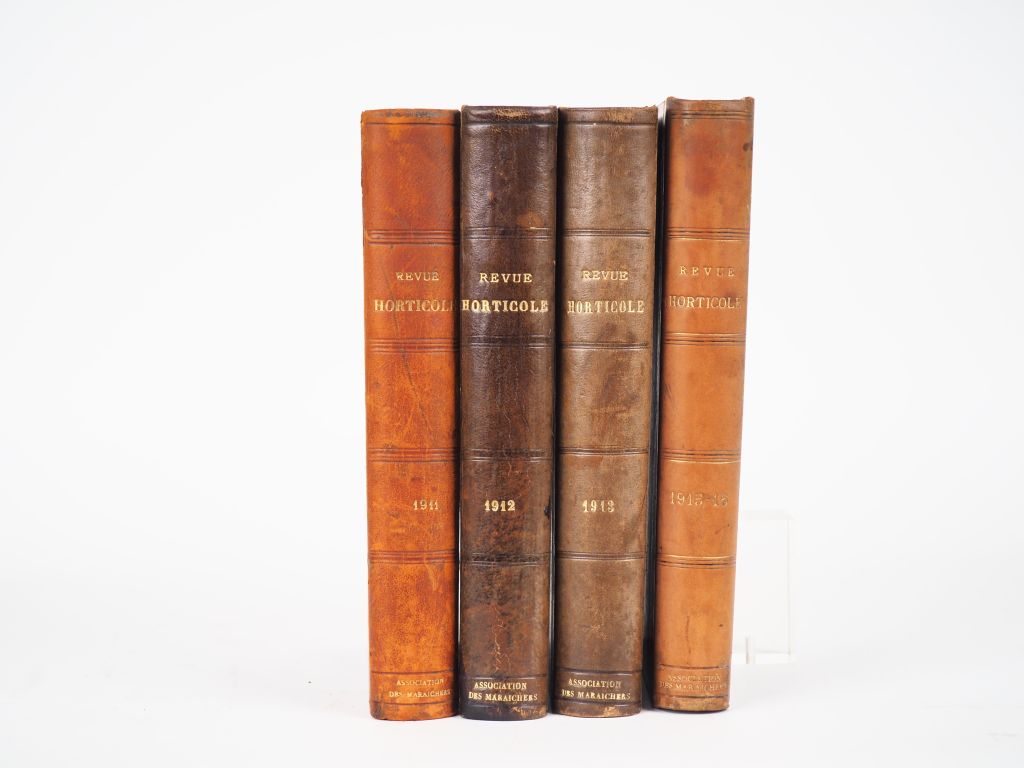 [BOTANIQUE]. REVUE HORTICOLE. Journal d’horticulture pratique. P., Librairie Agricole de la Maison Rustique, 1911-1916. Six tomes reliés en 4 volumes grand in-8 ½ basane, dos lisse, titre doré, mention Association des Maraîchers dorée en queue (Reliure de l'époque). SIX ANNÉES (1911 à 1916) correspondant aux tomes XI à XVI de cette nouvelle série. 63 PLANCHES de lithographies couleurs à pleine page de fleurs, fruits, champignons, insectes, etc.