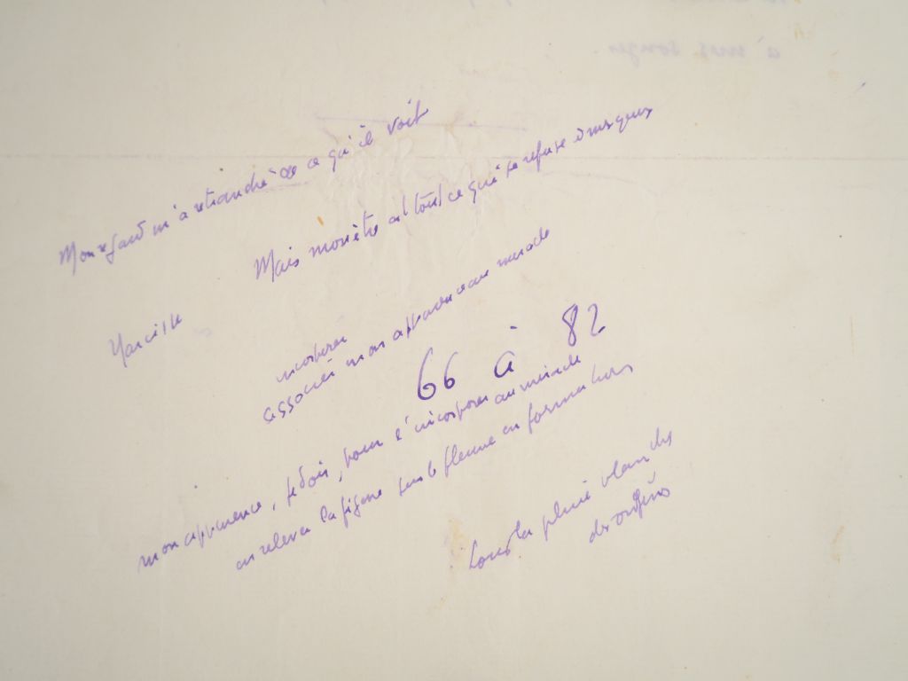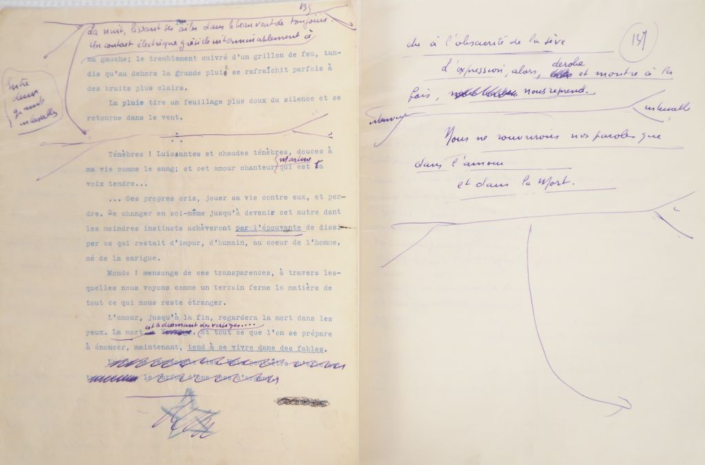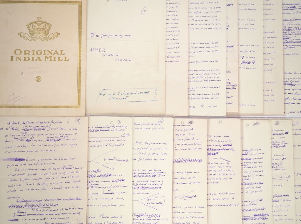 BOUSQUET (Joë). IL NE FAIT PAS ASSEZ NOIR. 150 ff. (27 X 21 cm) de papier vergé filigrané Original India Mill, contenant 1 feuillet de titre, 1 feuillet de faux-titre avec citation, 146 pages de texte numérotées de 1 à 138 (7 pages bis et ter et une page non numérotée entre pp. 48 et 49) rédigées uniquement au recto de chaque feuillet, (3) pages de table des matières. MANUSCRIT DE TRAVAIL COMPLET DU ROMAN DE JOË BOUSQUET PUBLIÉ CHEZ DEBRESSE EN 1932 et dédié à son père, avec 2 chapitres inédits dont un de 12 pages manuscrites. C’est avec ce roman que commence la carrière littéraire de Joë Bousquet. Son roman "Il ne fait pas assez noir" est en effet bien accueilli et des écrivains tels que Carlo Suarès, Jean Cassou ou Paul Éluard se montrent enthousiastes, « frappés par l’originalité de son écriture où les idées se revêtent de chair et les images, d’un poids de pensée, tantôt dans la profondeur des rapports poétiques, tantôt dans le faux air d’imaginaire qui se communique à la réalité immédiate » (René Nelli). Rédigé à l’encre violette, le manuscrit comprend aussi bien des pages sans ratures que des pages contenant de très nombreuses corrections (ratures, ajouts, 4 cartons manuscrits pp. 83, 105, 124 et 125, etc.) , 5 pages sont tapuscrites (pp. 52 à 54, 60, 75) et 2 cartons tapuscrits insérés aux pages 133 et 134, tous ces tapuscrits contenant des corrections manuscrites. Ainsi le manuscrit alterne des pages manifestement réécrites et mises au propre avec des feuillets constellés de corrections qui paraissent de premier jet. Bien qu’il s’agisse du texte définitif, nous avons relevé dans ce manuscrit un certain nombre de différences, plus ou moins importantes, avec le texte imprimé : tout d’abord des variations dans la ponctuation, les intervalles et les rejets de lignes ou de paragraphes. Puis une modification en fin de paragraphe de la page 72 du manuscrit : « Et je me répète en tremblant, désespéré de n’être qu’un homme, qu’au jour levant, pour condamner ma vie, mon bel amour a relevé la sienne. » qui devient page 115 de la version imprimée « qu’au jour levant, pour m’exiler, mon bel amour a relevé sa vie. » Enfin trois suppressions notables dans la version définitive sont à noter. Tout d’abord un paragraphe page 19 du manuscrit n’a pas été reproduit dans la version imprimée (page 92) : « J’attends toujours. J’ai trouvé dans mon cœur l’amour des mains qui se tendront vers les miennes. Mon cœur est assez fort pour m’ôter la force de les saisir. Les mots qui me viennent à la bouche, je craindrais trop que ma voix n’appelât sur eux tout le froid de ma solitude. Ils ne se tournaient pas vers ma vie sans raconter de quelle impossible présence ils me tiennent lieu. » , ensuite le court chapitre IV (13 lignes) de la version manuscrite a été entièrement supprimé : « Si par hasard tu rencontres la vérité, ce n’est pas le tout de l’amadouer. […] La vérité, nous ne saurions l’envisager que corrompue , nos yeux l’ignorent , ou la corrompent en la dévisageant. » , enfin le chapitre IX du manuscrit, constitué de 12 pages (pp. 99 à 110) a lui aussi été entièrement supprimé. On constate ainsi que le texte définitif imprimé est constitué de 10 chapitres et d’une postface alors que le manuscrit comptait 12 chapitres et une postface. En fait Bousquet a nommé 2 chapitres « II » dans le manuscrit , le second chapitre numéroté « II » commençant par « Je m’éveille sous un ciel gris […] » deviendra le chapitre « III » dans la version imprimée tandis que le chapitre III du manuscrit (« L’ombre de cette chambre […] ») deviendra le chapitre IV de la version imprimée. Dans la partie inférieure de la page de titre, on trouve cette énigmatique mention manuscrite : « Lire en le traduisant un texte allemand » , on notera également que la page de titre a été agrémentée d’un bandeau sur lequel Bousquet a inscrit en escalier ces trois mots : « Aimer / Donner / Mourir » , enfin, la dernière partie de l’ouvrage, qui suit le chapitre X, est intitulée dans la version imprimée : « Et la préface ? ... » alors que dans le manuscrit Bousquet n’a pas donné de titre à cette dernière partie et a seulement précisé : « Commencer une page après de très larges blancs ». On trouve des notes manuscrites au verso de quelques feuillets du texte de Bousquet : p. 65 (« Mon regard m’a retranché de ce qu’il voit / Mais mon être est tout ce qui se refuse à mes yeux / Narcisse / Incorporer / associer mon apparence au miracle [etc.] », p. 78 (« le verbe reprend ses droits » [biffé] et enfin p. 138 un long texte biffé : « Te voir et t’aimer, c’est avant tout vivre, et faire la mort et l’hiver dans tout ce qui précédait ta venue, c’est croire en toi, croire que ton âme était assez belle pour créer la mienne et pour en inventer la vie à travers tout [etc.] T’aimer, c’est me quitter, douter au bénéfice de ce que tu me dis de cela même qui tombe au pouvoir de mes sens. » On JOINT la chemise cartonnée du bloc de papier à lettres « Original India Mill » d’où proviennent très probablement les feuillets de ce manuscrit. Elle contient plusieurs mentions manuscrites : « particulier, / particularisation » - « trogne confite » - « après le présent chapitre / cahier noir et / littérature [entouré] / puis / avant [?] / enfin / coffret à cigarettes » et d’autres mentions malheureusement à demi-effacées, difficilement lisibles. IMPORTANT DOCUMENT MANUSCRIT, EN FEUILLES, DE LA PREMIÈRE ŒUVRE LITTÉRAIRE D’IMPORTANCE DE JOË BOUSQUET. ¶ Joë Bousquet, Œuvres complètes, tome I, préface de René Nelli, pp. 79 à 82, Albin Michel, 1979.
