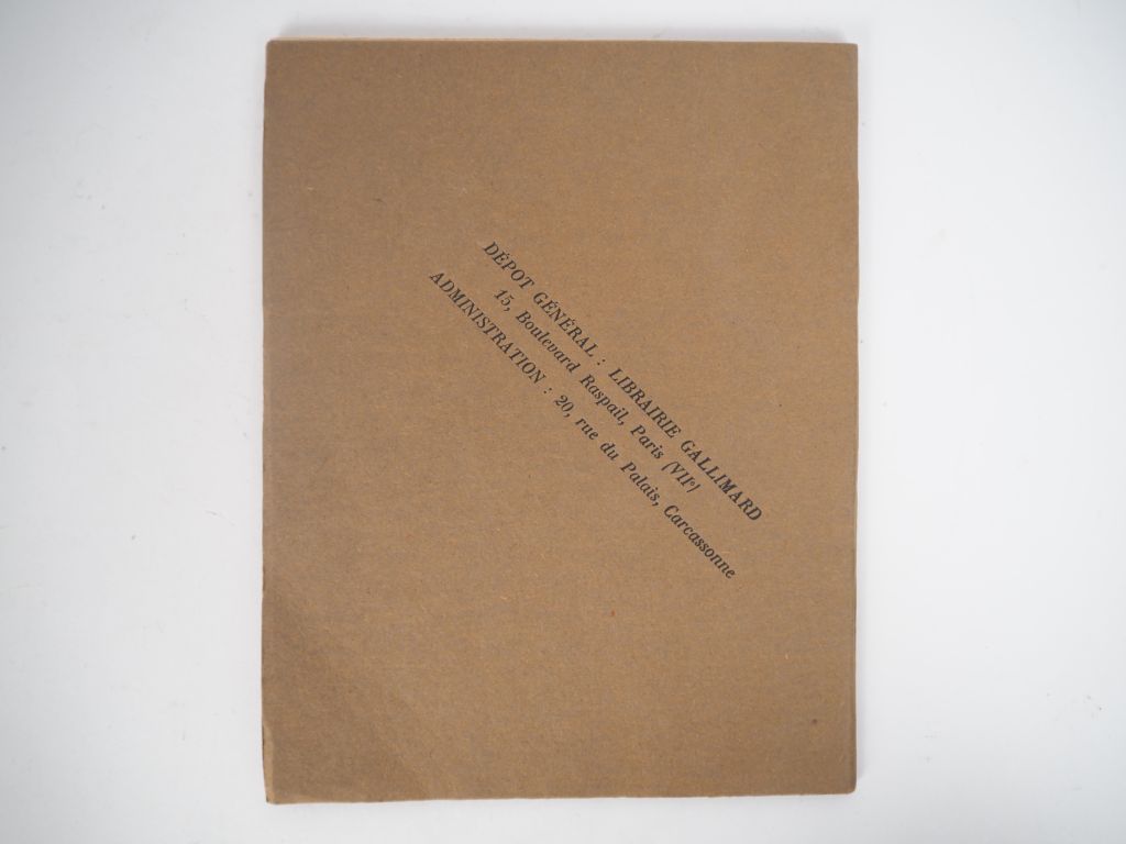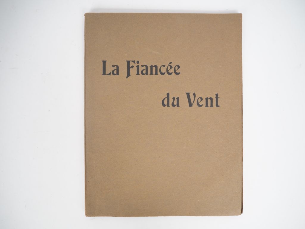 BOUSQUET (Joë). LA FIANCÉE DU VENT. Carcassonne, Imprimerie P. Polère, [Chantiers, 1928]. In-4 broché. ÉDITION ORIGINALE, RARE, du PREMIER LIVRE de Joë Bousquet, paru anonymement. Texte liminaire de 9 lignes signé Jean-Flour Montastruc, pseudonyme de Joë Bousquet. Elle contient un frontispice en noir d’après Louis HAGHE et 4 illustrations hors-texte de Georges CAZENAVE tirées en sépia. Exemplaire non coupé, en parfait état. Au 2nd plat on trouve imprimée la mention : « Dépôt général : Librairie Gallimard / 15, Boulevard Raspail, Paris (VIIe) / Administration : 20, rue du Palais, Carcassonne ».