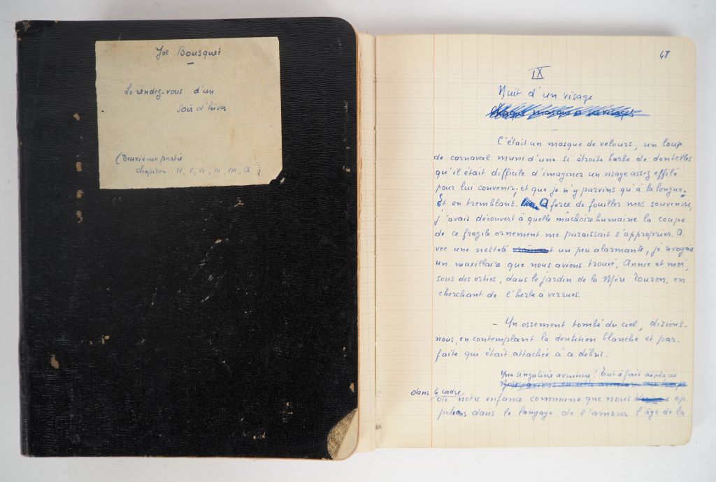 BOUSQUET (Joë). LE RENDEZ-VOUS D’UN SOIR D’HIVER. Deux cahiers in-4 : le 1er ½ toile rouge, plats cartonnés, étiquette papier de titre collée au 1er plat, dos lisse muet , 119 ff. - le 2nd toile maroquinée noire, étiquette papier de titre collée au 1er plat, dos lisse muet , 58 ff. MANUSCRIT DE TRAVAIL COMPLET DU ROMAN DE JOË BOUSQUET PUBLIÉ CHEZ DEBRESSE EN 1933 et dédié à Jean Cassou, l’ami de la première heure. Il s’intitula d’abord "Écoute ma chérie" (mars 1929) avant que Bousquet en adopte le titre définitif le mois suivant. Il s’agit d’un texte extrêmement poétique, décrivant notamment la passion amoureuse qu’éprouva Joë Bousquet pour Ginette Augier qui apparait dans cette fiction sous les traits d’Annie. « Le Rendez-vous d’un soir d’hiver marque un moment important dans la mythologie secrète du poète. Joë va se prendre au piège de l’enfance, parce qu’une enfance est venue qui ressemblait à la sienne. » (Ginette C.-Augier). Ce manuscrit est constitué de 2 cahiers. Le 1er contient une page de titre, 119 pages de texte numérotées de 1 à 118 et une page de table des matières - le 2nd cahier contient un feuillet blanc couvert de notes au verso, 57 pages de texte numérotées de 119 à 176, la dernière constituée de la Table des matières. Rédigé à l’encre bleue, ce manuscrit contient de nombreux cartons, corrections, biffures, ajouts , Bousquet a rédigé sur les seuls rectos des feuillets, tandis que de nombreuses pages en regard du texte sont couvertes de notes qui ont ensuite été biffées. Certains chapitres du manuscrit portent les stigmates plus prononcés du travail de composition et de réécriture de l’écrivain : ainsi dans la 1ère partie le 3ème chapitre, la fin du 10ème chapitre et le commencement du 11ème qui contiennent de nombreux cartons. Le chapitre 4 de la 2nde partie a été également très retravaillé avec de nombreux repentirs, des cartons ayant parfois été collés les uns sur les autres. Le roman comprend deux parties, la première constituée de 15 chapitres, la seconde en comprenant 10. Les gardes des cahiers contiennent de nombreuses notes manuscrites de Bousquet. Sur la 1ère garde du 1er cahier on peut lire, avant qu’elles aient été biffées, les notes suivantes : « Faire évoluer, s’il y a lieu, le sentiment de Paul Servan à travers les horizons infinis qu’il lui découvre : et c’est en vue de cela qu’il faudrait introduire l’épisode du [conte ?] musulman, sur les deux arbres. [Etc.] », puis, en bas de page : « Très important : les paysages ont toujours la couleur des pensées [etc.] » et en regard, cette note jetée en marge de la page de titre : « l’inaccessible, soit dans le temps, soit dans le perfectionnement individuel ». Et sur les gardes du plat inférieur : « 10 septembre : Donner plus de force à cette première partie. Trouver le point où la nudité chante », puis « Le rire est libre comme l’air. Ris tant que le rire est au monde. Et puis, tu aurais beau te débattre avec tes grands gestes d’insecte, de guêpe, tu ne sortiras pas vivant de la maison de porcelaine, parce que c’est la nuit qui t’y a jeté » , et enfin : « Les nuits de rêve où je pleurais en écoutant chanter les hommes ». Toutes ces notes ont été biffées… Les notes sur les gardes du 2nd cahier sont également très abondantes : une liste « fétichisme / masochisme / homosexualité / inceste / narcissisme / masturbation / crime », puis « Le nom de Montségur était un souvenir dans les chansons de ma nourrice [etc.] » ou bien encore « La vie est difficile. On se met comme on peut à la place de son malheur. Et ce ne serait pas assez de baisser la voix. Il y a une nuit dans le cœur pour les yeux plus grande que le jour [etc.] » et enfin : « pourquoi un souci comme le mien passait-il doucement dans la chute des roses qui élevait jusqu’au ciel les paroles d’un air des rues ». Ces notes renvoient au texte imprimé page 202 de l’édition Albin Michel du t. 1 des Œuvres complètes et page 120 du manuscrit : « Je sais que la vie est difficile. Si haut que les jours volent, le vent toujours le même soutient leurs ailes avec de l’ombre. Mais pourquoi un souci comme le mien passait-il doucement dans la chute de roses qui élevait jusqu’au ciel les paroles d’un air des rues ? ». IMPORTANT DOCUMENT, ce manuscrit fixant le texte définitif et permettant de visualiser « le travail en train de se faire », c’est-à-dire la genèse de l’œuvre de Joë Bousquet. ¶ Joë Bousquet, Œuvres complètes, tome I, préface de Ginette C.-Augier, pp. 147 à 153, Albin Michel, 1979.