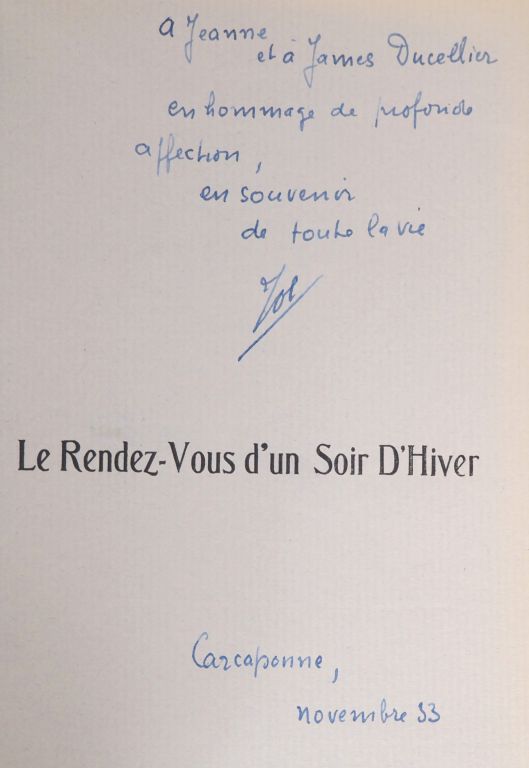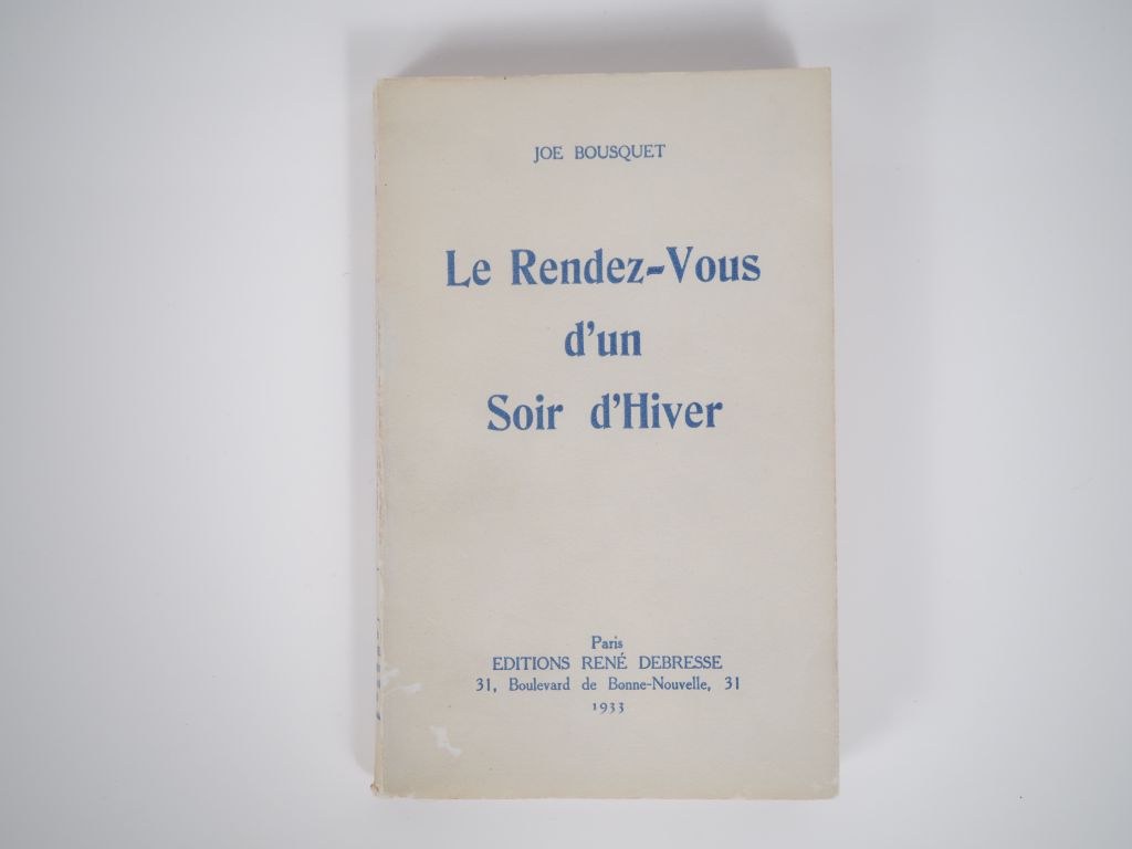 BOUSQUET (Joë). LE RENDEZ-VOUS D’UN SOIR D’HIVER. P., Debresse, 1933. In-12 broché. Infime accroc avec petite déchirure en marge latérale de 2 ff. ÉDITION ORIGINALE dédiée à Jean Cassou. Tirage de luxe limité à 50 exemplaires. UN des 20 du tirage de tête numérotés sur vergé Hollande teinté bleu. ENVOI AUTOGRAPHE signé sur le faux-titre : « à Jeanne et à James Ducellier / en hommage de profonde affection, en souvenir de toute la vie / Joe / Carcassonne, novembre 33 ».