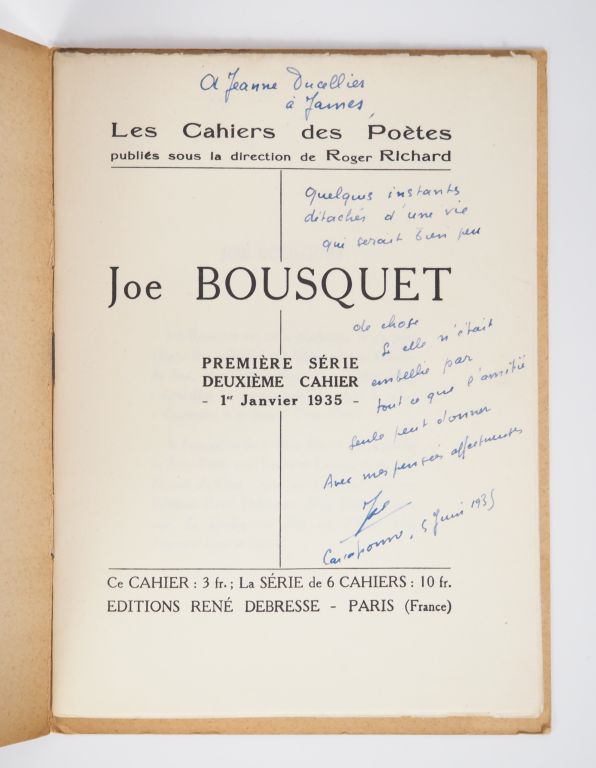 BOUSQUET (Joë). LES PETITS PAPIERS DE MONSIEUR SUREAU. P., Debresse, 1935. Grand in-12 broché, couverture argentée. ÉDITION ORIGINALE en volume de ce qui constitue le 2ème cahier de la 1ère série des Cahiers des Poètes. ENVOI AUTOGRAPHE signé sur le titre : « à Jeanne Ducellier /à James, quelques instants détachés d’une vie qui serait bien peu de chose si elle n’était embellie par tout ce que l’amitié seule peut donner /Avec mes pensées affectueuses / Joe / Carcassonne, Carcassonne, 5 juin 1935 ». JOINT : LES PETITS PAPIERS DE MONSIEUR SUREAU. P., Debresse, 1935. Plaquette in-12 agrafée. Rousseurs claires, plus marquées sur le 1er plat et les 4 premiers ff. ÉDITION ORIGINALE du 2ème cahier de la 1ère série des Cahiers des Poètes, imprimée sur papier Impondérable.