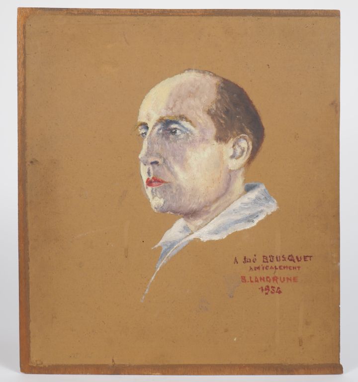 [BOUSQUET (Joë)]. PORTRAIT DE JOË BOUSQUET. Huile sur toile brune collée sur plaque d’Isorel (36,5 X 32,3 cm environ). Fente verticale au verso de la plaque Isorel. BEAU PORTRAIT COULEURS de l’écrivain par le peintre Bernard LANGRUNE (1889-1961). Il contient un ENVOI AUTOGRAPHE sous le portrait, à l’huile, en grenat et rouge : « A Joë Bousquet / amicalement / B. Langrune / 1934 ».