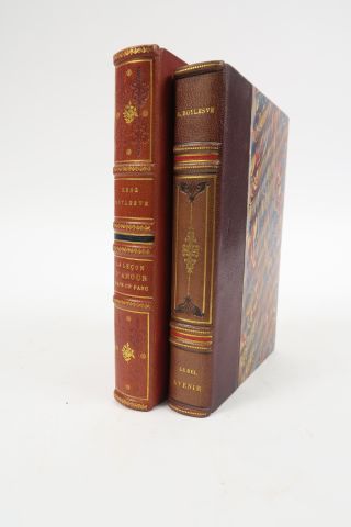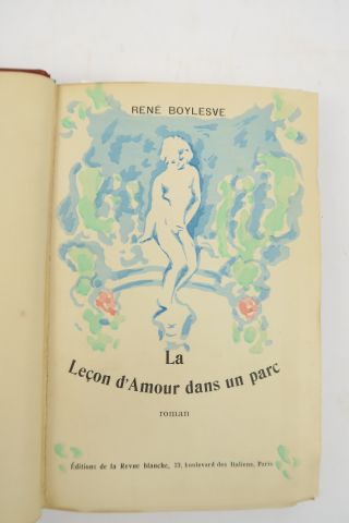 BOYLESVE (René). La leçon d'amour dans un parc. Roman. Paris, Editions de la Revue Blanche 1902. in-8. 1/2 chagr. rouge, dos à 4 nerfs finement orné de roulette, caissons et fleur. dor., listel de maroquin bleu au centre, couv. et dos cons. (Rel. d'époque). Edition originale. 1/15 sur vélin du Marais (non num.). Belle couverture illustrée en couleurs. Joint : – BOYLESVE (René). Le bel avenir. Paris, Calmann Levy (1905). in-12. 1/2 chagr. brun, décor dor. et mosaïqué, tête dor., couv. et dos.